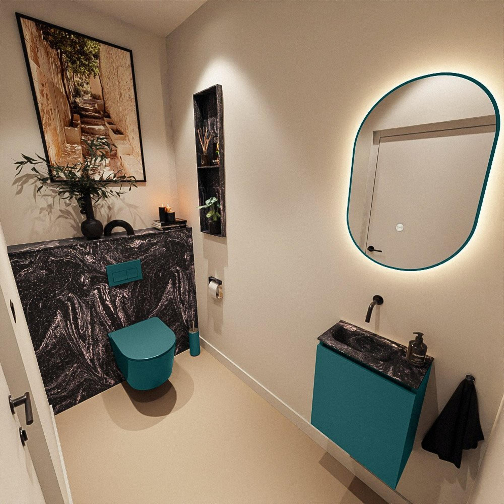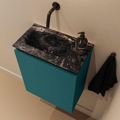 Le meuble de couleur Smag forme, avec le lavabo noir Lava, un look contemporain et luxueux qui s’intègre parfaitement dans les salles de bains et toilettes modernes. Le lavabo Solid Surface de la série Eden présente des lignes épurées et une finition mate haut de gamme, ce qui lui permet de se marier aisément avec des robinets noirs, des détails gunmetal ou des carreaux en pierre naturelle. Comme le lavabo est positionné à gauche, il crée un bel équilibre sur le mur et vous disposez visuellement de plus d’espace de l’autre côté. Le design sans poignée s’accorde parfaitement avec les intérieurs minimalistes, où l’accent est mis sur des surfaces calmes et un ensemble ordonné.