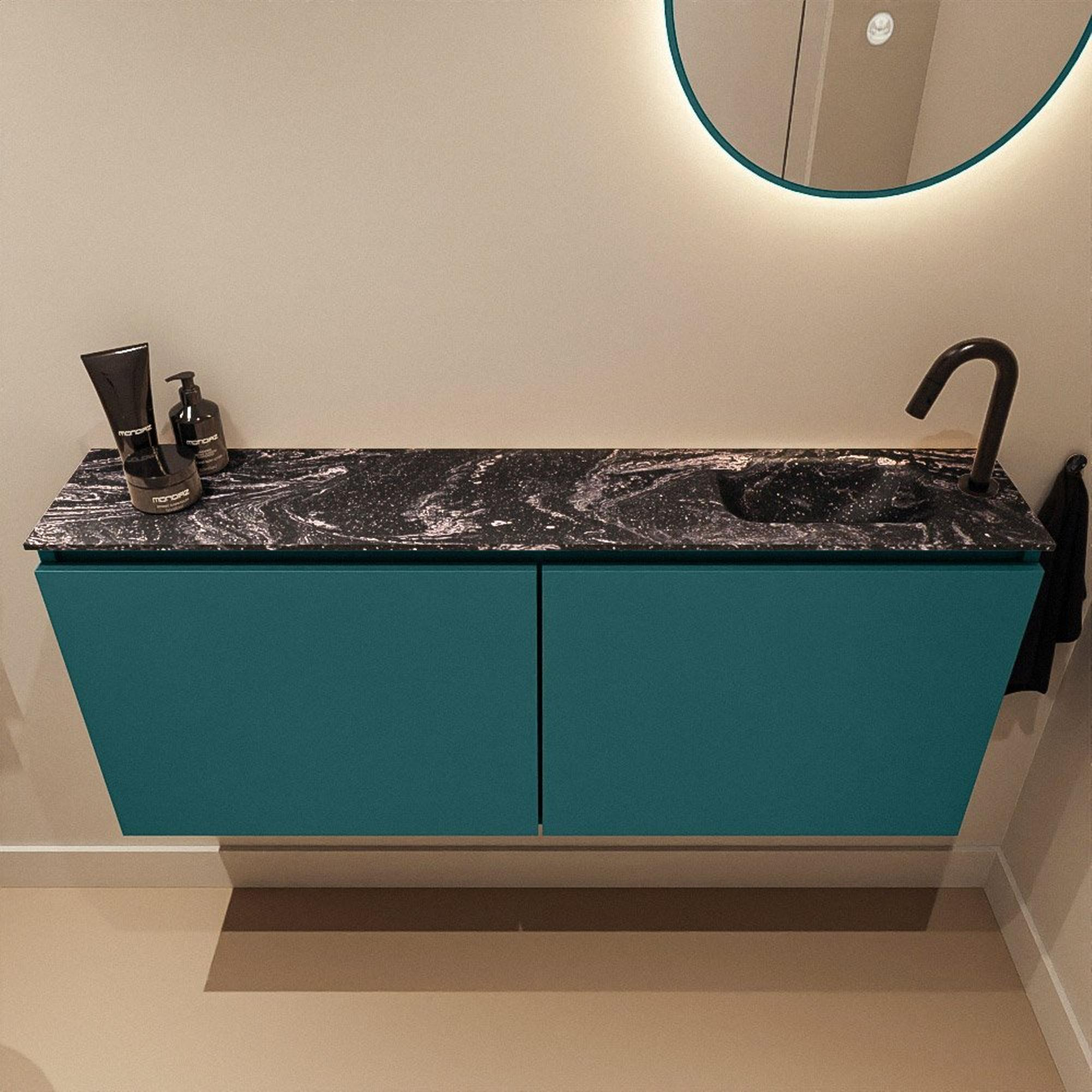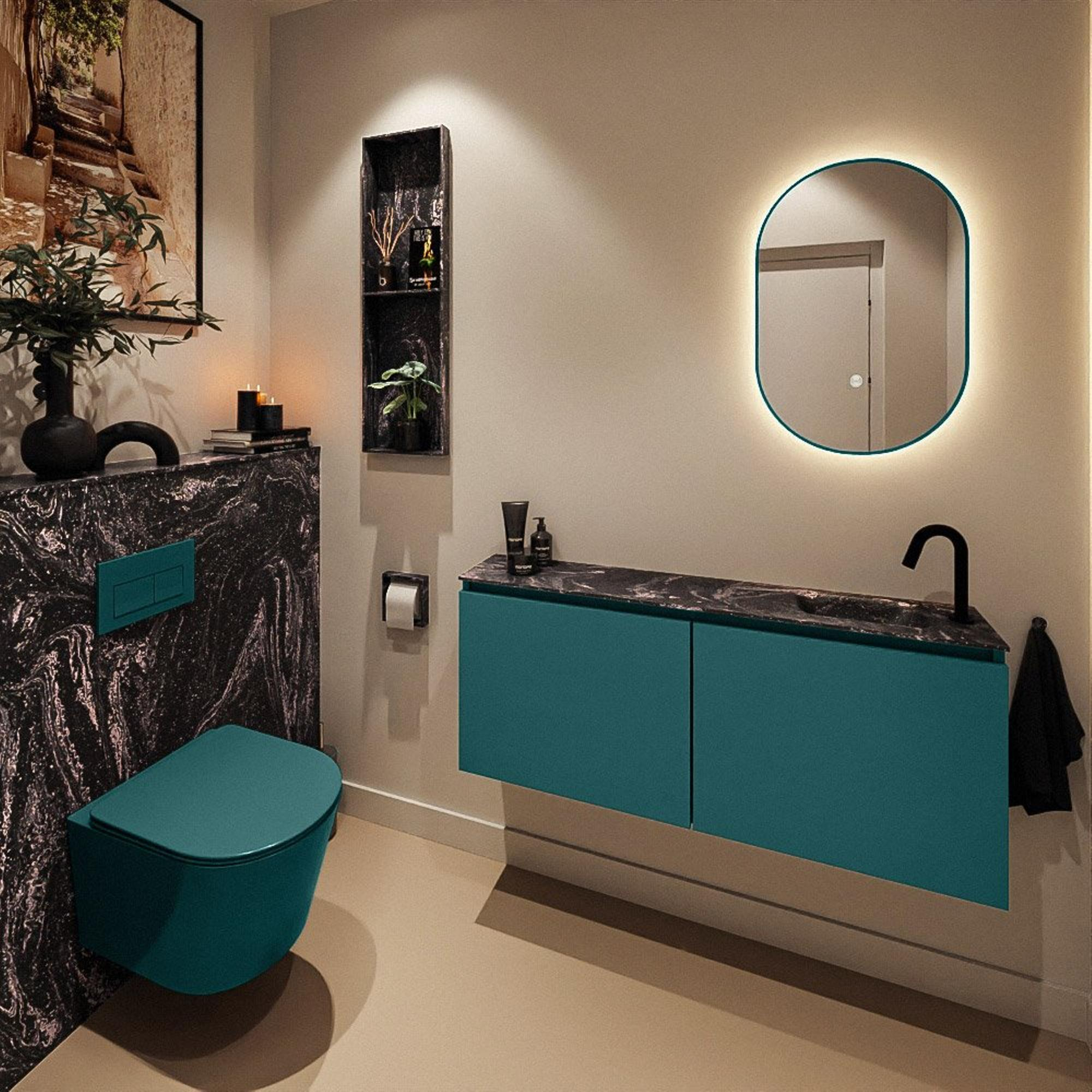 Avec ce meuble WC compact mais remarquablement élégant, vous ajoutez en une seule fois fonctionnalité et design à vos toilettes ou à votre petite salle de bains. Grâce à sa faible profondeur, il s’intègre sans effort dans les espaces étroits, tandis que la largeur généreuse de 120 cm crée une ligne horizontale luxueuse le long du mur. La couleur verte Smag offre un aspect moderne et élégant qui se marie à merveille aussi bien avec des carreaux clairs qu’avec des intérieurs sombres, style hôtel chic. Le lavabo épuré en finition noire Lava avec trou de robinet à droite en fait un choix idéal lorsque votre alimentation en eau ou l’agencement l’exige, par exemple avec un WC suspendu ou une porte qui s’ouvre vers l’intérieur. Grâce à la combinaison bien pensée du meuble et du lavabo, vous créez un espace de rangement et de lavage fonctionnel, sans que la pièce paraisse surchargée. Parfait pour ceux qui aiment le design moderne, le luxe subtil et un ensemble calme et ordonné.