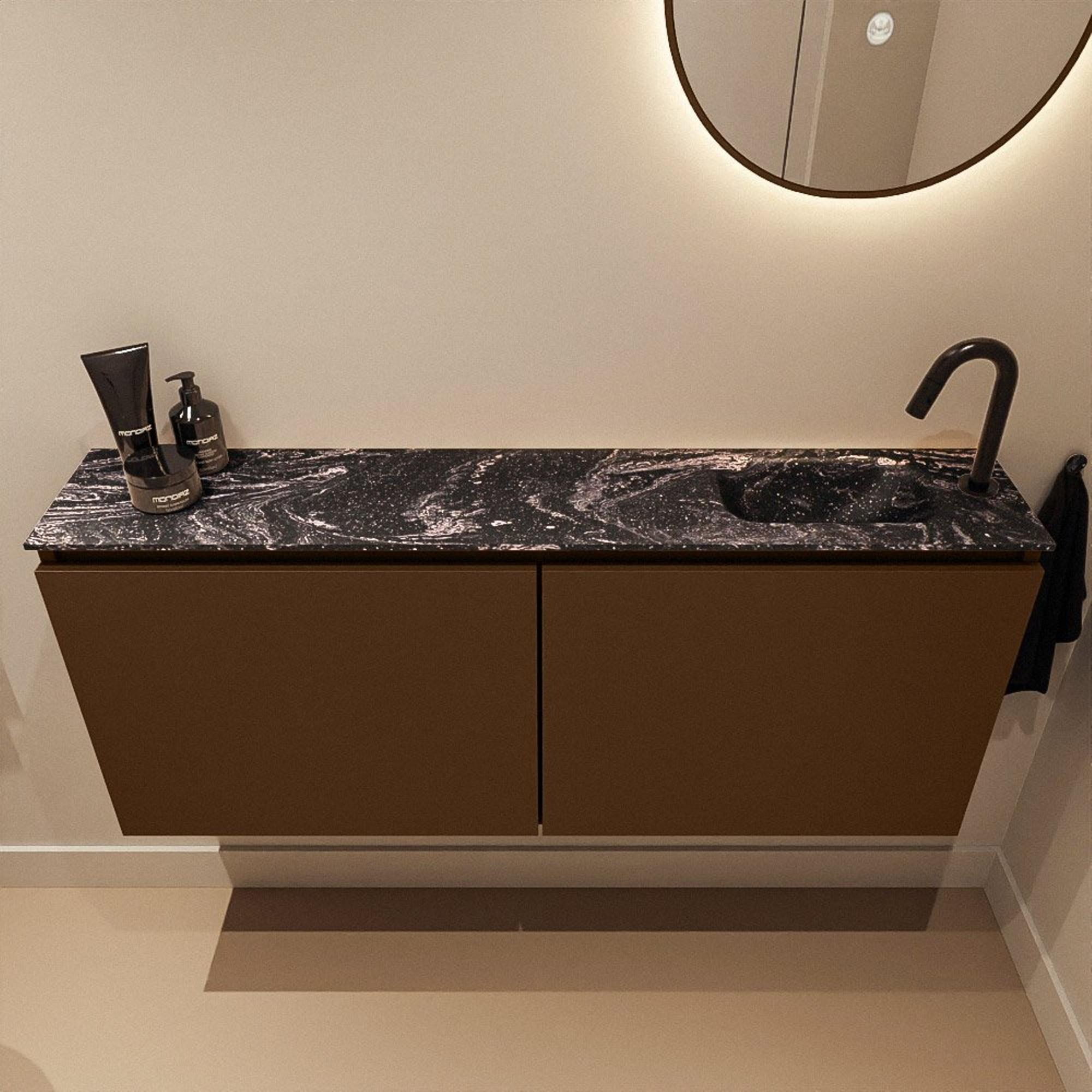 - Combinaison moderne d’un meuble bas couleur Rust avec lavabo Lava noir.