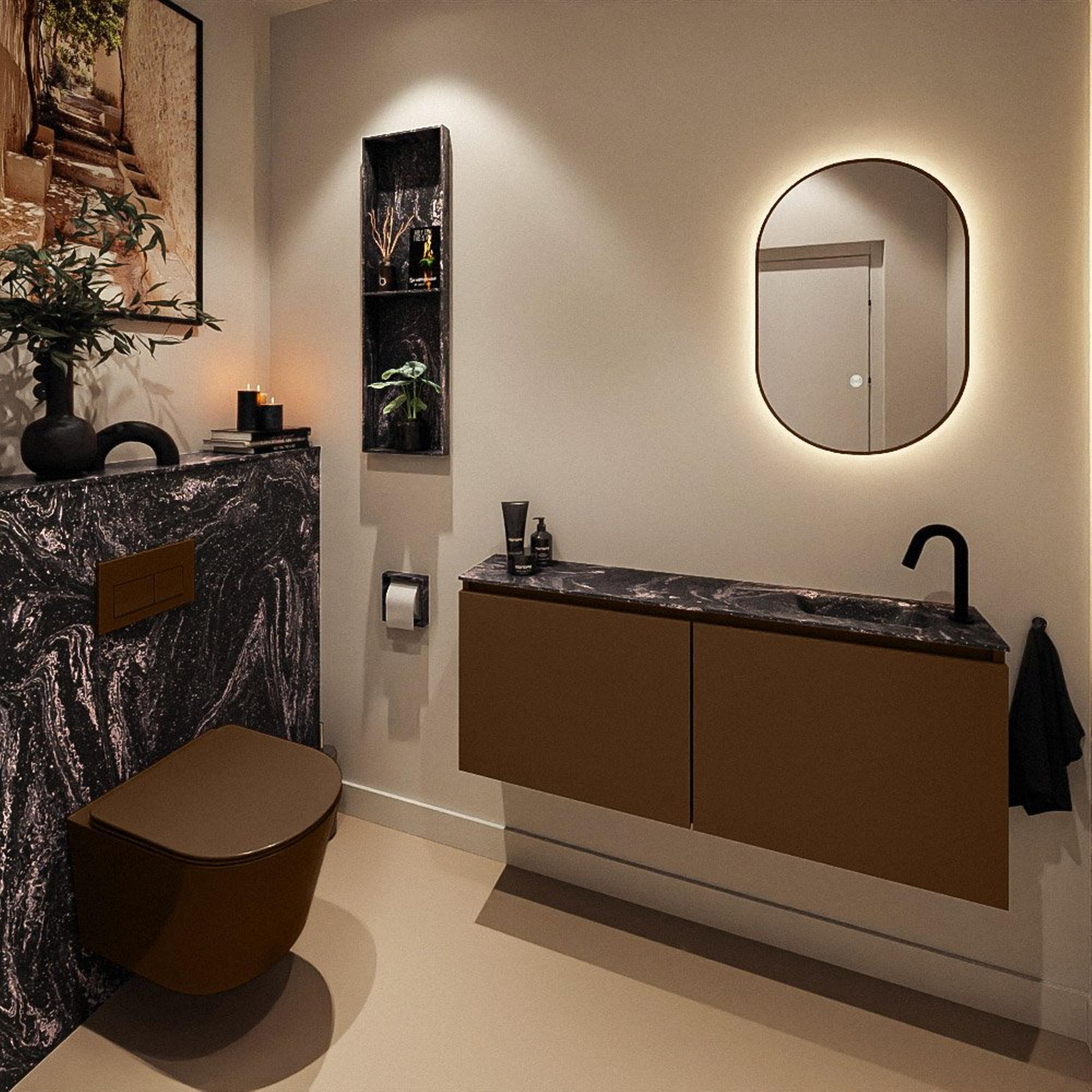 La couleur chaude Rust du meuble bas, associée au lavabo en Solid Surface noir Lava, crée une apparence luxueuse et contemporaine. Ce mélange d’effet bois et de noir profond s’accorde sans effort avec des carreaux modernes, des effets béton chic et des robinets noirs ou en métal brossé. Les façades sans poignées accentuent les lignes épurées et offrent une impression d’ensemble calme et ordonnée. Avec un seul meuble, vous posez ainsi la base d’un ensemble stylé dans lequel les détails tels que le porte-rouleau WC, le miroir et l’éclairage peuvent facilement être harmonisés avec la même ligne moderne. Idéal si vous souhaitez faire une déclaration design tout en gardant un ensemble sobre et intemporel.