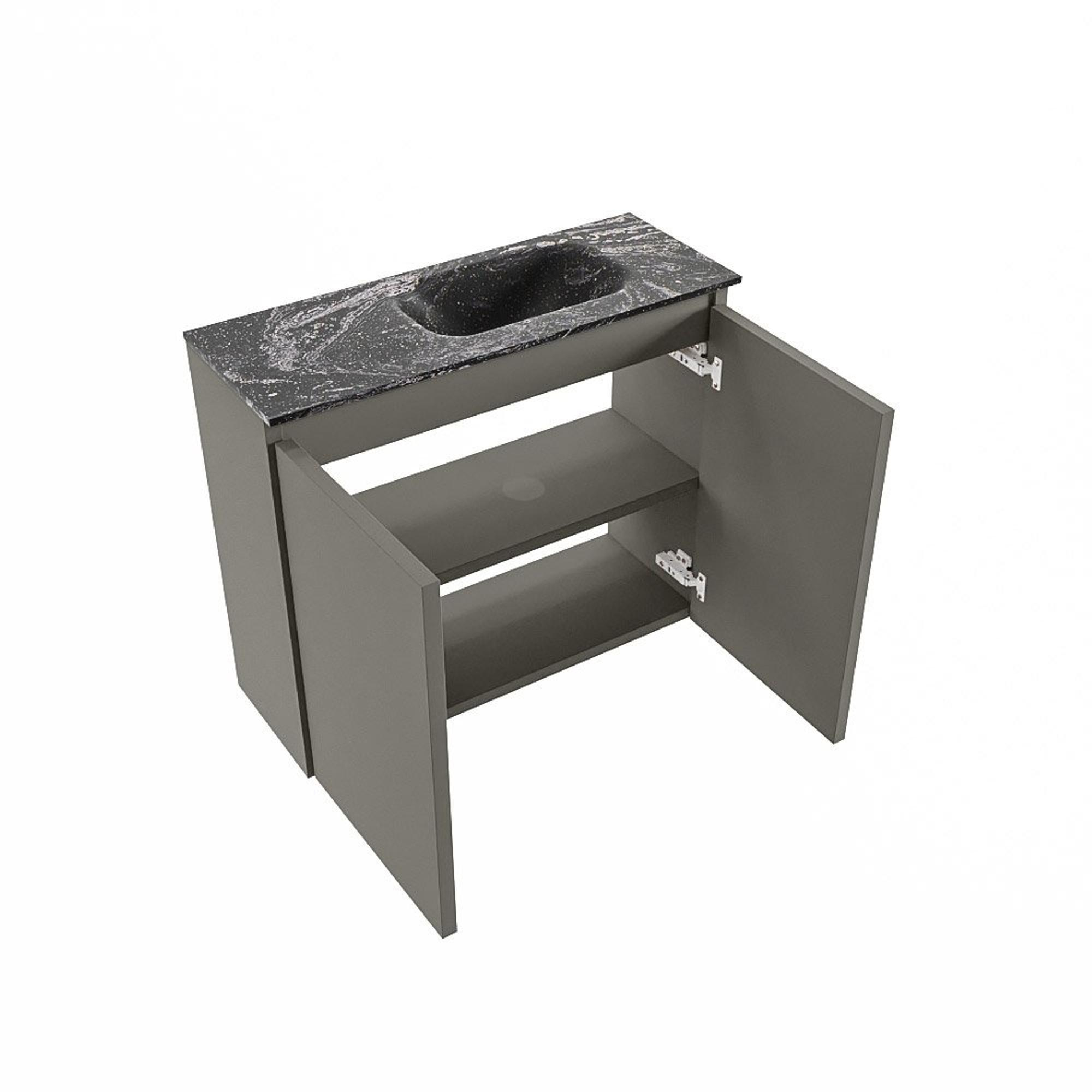 La couleur smoke du meuble – un ton anthracite moderne – forme un superbe contraste avec le plan de lavabo noir. Cette combinaison ton sur ton a une apparence luxueuse et contemporaine, et s’accorde parfaitement avec des styles populaires comme l’industriel, le moderne ou l’hôtellerie chic. Les lignes droites et le design sans poignées confèrent une allure minimaliste, ce qui permet d’associer facilement le meuble à des robinets noirs, des accessoires noir mat ou, au contraire, à des essences de bois chaudes et un éclairage doux. Grâce à la position du lavabo sur le côté droit, l’ensemble n’est pas seulement esthétiquement bien équilibré, mais aussi logique à l’usage lorsque le passage ou la porte se trouve sur la gauche. Vous ajoutez ainsi avec un seul meuble compact à la fois de l’ambiance et de la fonctionnalité à vos toilettes.