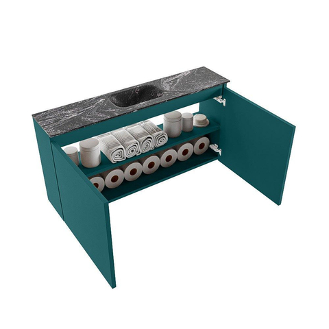 La couleur verte Smag du meuble donne immédiatement du caractère à vos toilettes et s’harmonise parfaitement avec les intérieurs modernes, naturels ou luxueux. Associé au plan de lavabo noir en Solid Surface de la série Eden, il crée un contraste élégant qui rappelle les salles de bains d’hôtel haut de gamme. Le lavabo est placé au centre, ce qui assure un aspect symétrique et apaisant le long du mur. Grâce au lavabo sombre, les accessoires en noir mat, en chrome ou en métal brossé ressortent particulièrement bien. Vous créez ainsi un ensemble complet et bien pensé avec peu d’éléments.