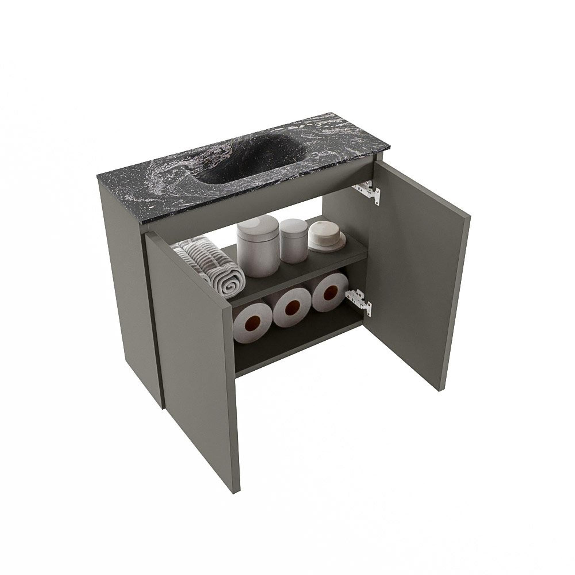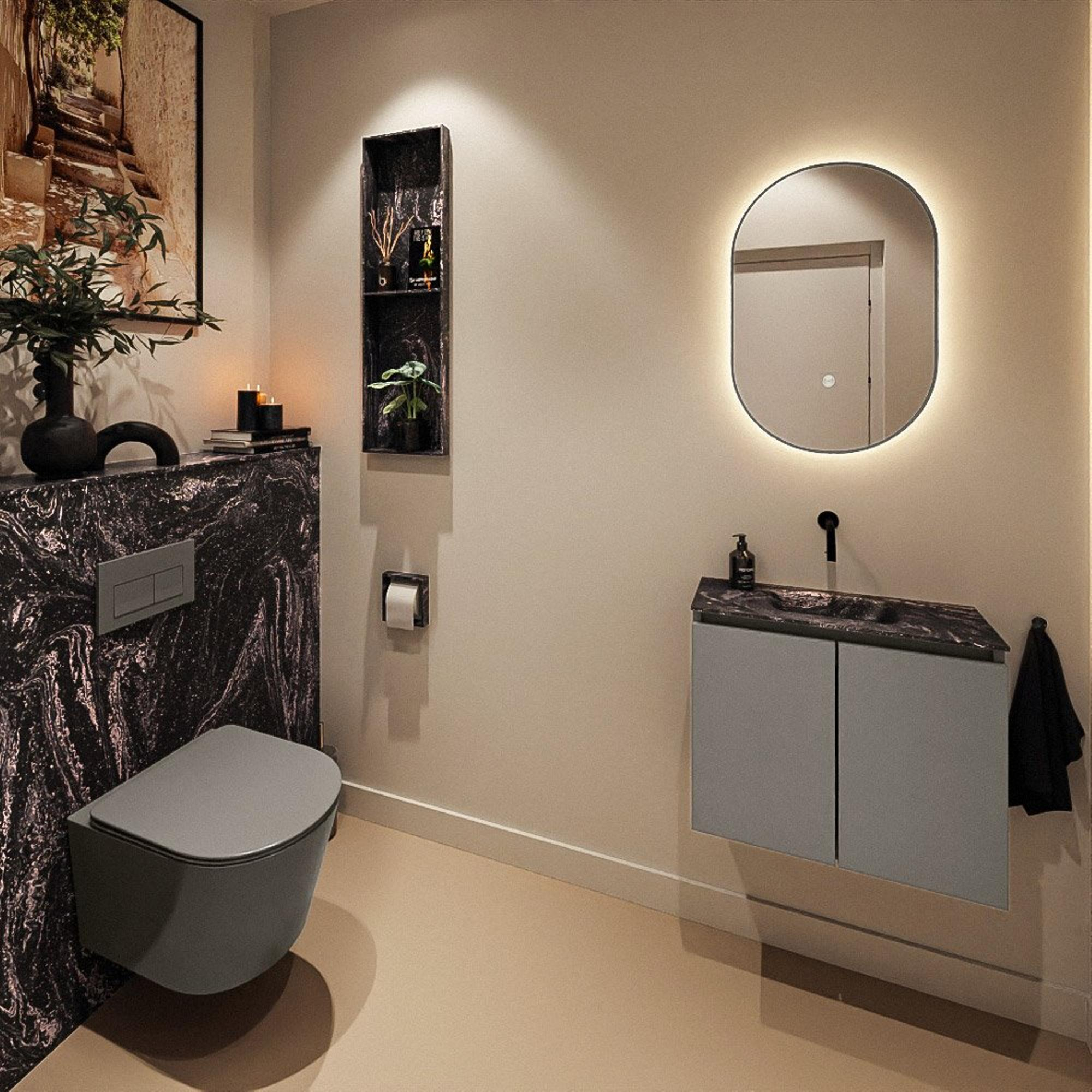 Ce meuble WC compact est idéal si vous souhaitez aménager de manière soignée et élégante un petit espace toilettes, un hall ou une salle de bains pour invités, sans faire de concessions sur la qualité. Grâce à sa faible profondeur, il s’intègre facilement dans les espaces étroits, tout en vous offrant un lavabo complet avec suffisamment d’espace pour vous laver les mains confortablement. Le meuble moderne gris fumé combiné au plan de lavabo profond et sombre confère une allure raffinée digne d’un hôtel, qui s’harmonise parfaitement avec un style d’intérieur moderne ou industriel. Si vous recherchez une solution pratique pour ranger discrètement quelques accessoires de toilette, combinée à un lavabo design qui s’impose visuellement dans votre petit espace, alors ce meuble est un choix particulièrement astucieux.