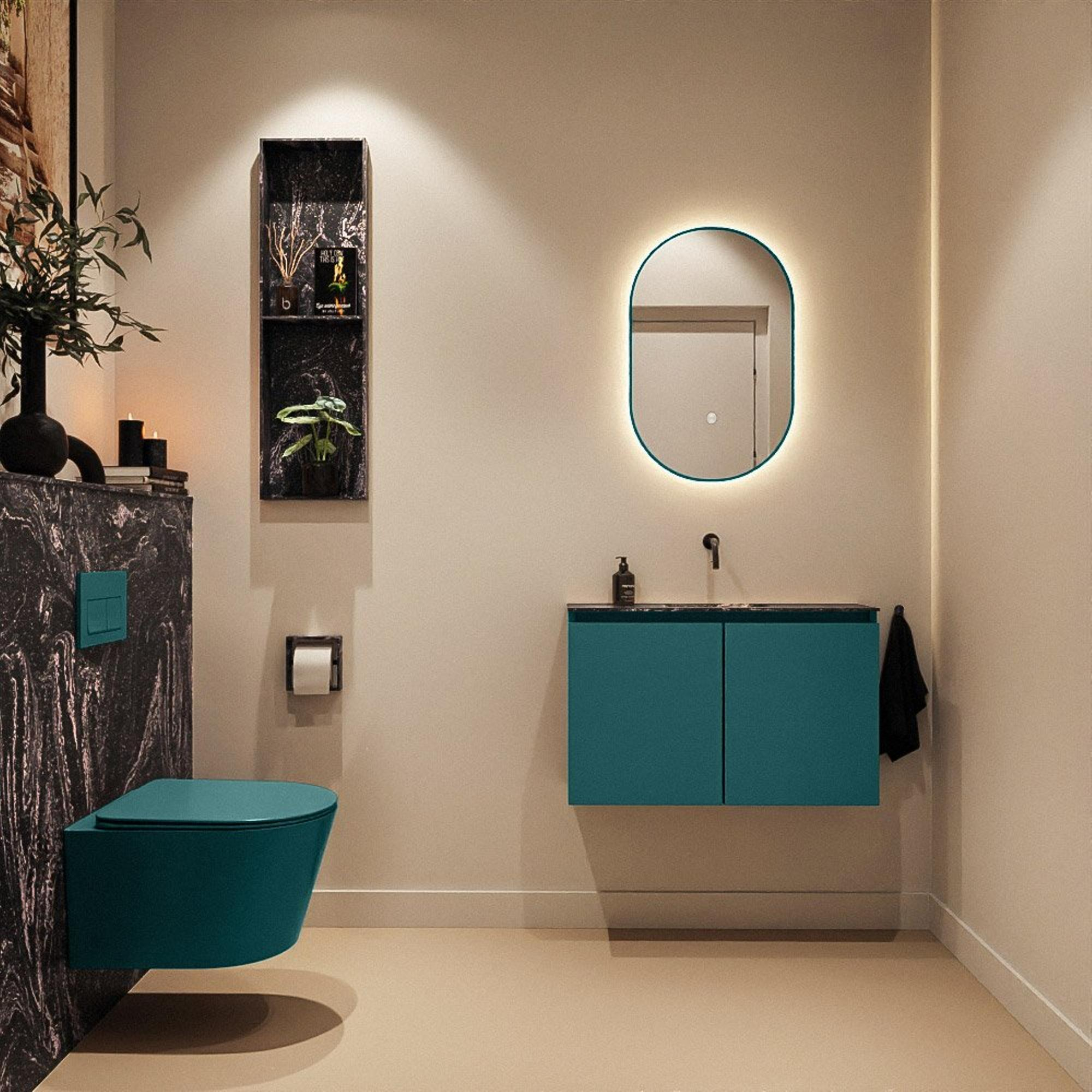 Avec une largeur de 80 cm et une faible profondeur de 23 cm, vous exploitez au mieux l’espace disponible, sans que le meuble paraisse massif ou gênant. La position centrale du lavabo offre une apparence agréable et symétrique et rend l’utilisation très confortable, même lorsque plusieurs personnes partagent les toilettes. Le meuble bas avec deux portes offre un espace de rangement étonnamment généreux pour les rouleaux de papier toilette, les serviettes invités et les produits d’entretien, afin que vous puissiez tout conserver soigneusement hors de vue. Ainsi, vos toilettes restent ordonnées et bien organisées, ce qui crée immédiatement une atmosphère luxueuse et apaisante.