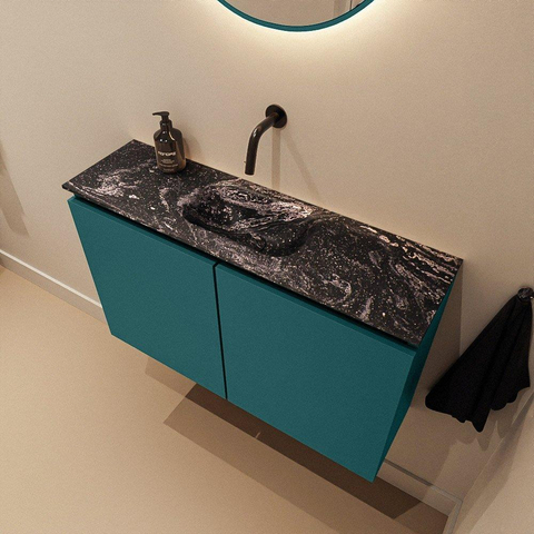 La combinaison de la couleur Smag pour le meuble et du lavabo noir Lava confère une apparence contemporaine et luxueuse qui attire immédiatement le regard dès que vous entrez dans la pièce. Le design sans poignées renforce les lignes épurées et s’intègre parfaitement à un style de salle de bains moderne ou minimaliste. Grâce au lavabo foncé, le dessus du meuble devient un véritable point focal, tandis que le caisson en Smag apporte chaleur et profondeur. Cela permet d’associer facilement le meuble aussi bien à des carreaux clairs qu’à un effet béton ou à des tons boisés, vous offrant ainsi une grande liberté pour le reste de la conception de votre salle de bains.