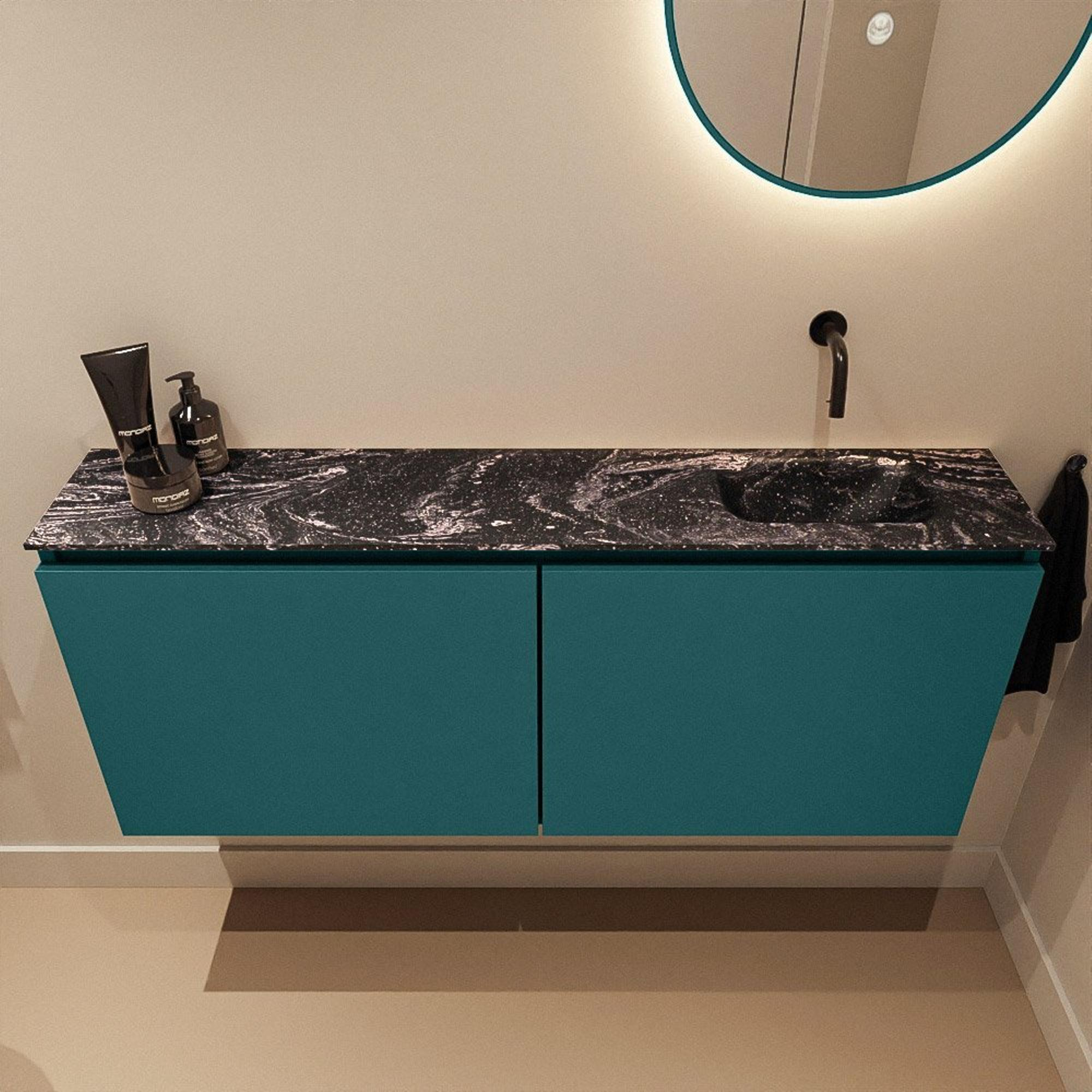La couleur Smag, une teinte verdâtre élégante, apporte une base contemporaine et néanmoins apaisante à vos toilettes. Associée au plan de vasque noir en solid surface coloris Lava, elle crée un contraste chic qui confère immédiatement une allure luxueuse. Les façades sans poignées renforcent le caractère minimaliste : aucune poignée interrompant les lignes, mais des lignes droites qui se prolongent harmonieusement. Le lavabo est conçu avec la cuve et la plage de dépose sur le côté droit, ce qui rend ce meuble parfait si votre réseau de conduites ou l’agencement de la pièce l’exigent. Le look moderne se marie parfaitement avec des robinets et accessoires noirs mats ou en métal brossé pour un ensemble complet et bien pensé.