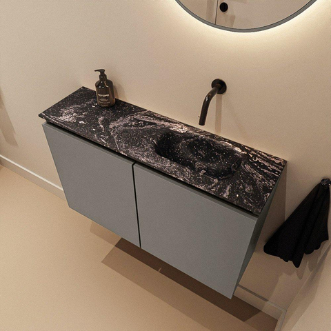 Le lavabo Eden assorti en finition Lava est réalisé en solid surface, un matériau mat et lisse, résistant et facile d’entretien. Comme le lavabo n’a pas de trou de robinet, vous le combinez avec un mitigeur mural ou un mitigeur posé à côté de la vasque, ce qui crée un aspect encore plus épuré et architectural. La cuve est positionnée à droite, ce qui vous laisse plus d’espace de dépose à gauche pour le savon, les accessoires ou une petite décoration. Grâce aux propriétés antibactériennes du meuble et à la surface lisse du solid surface, l’ensemble est facile à nettoyer et extrêmement hygiénique au quotidien.