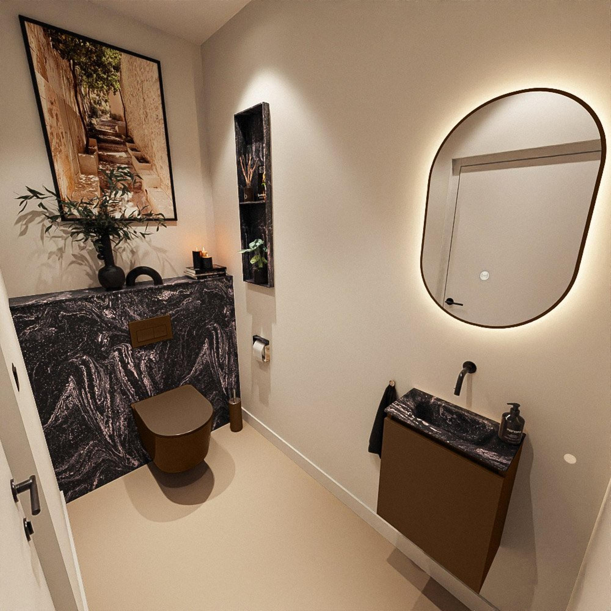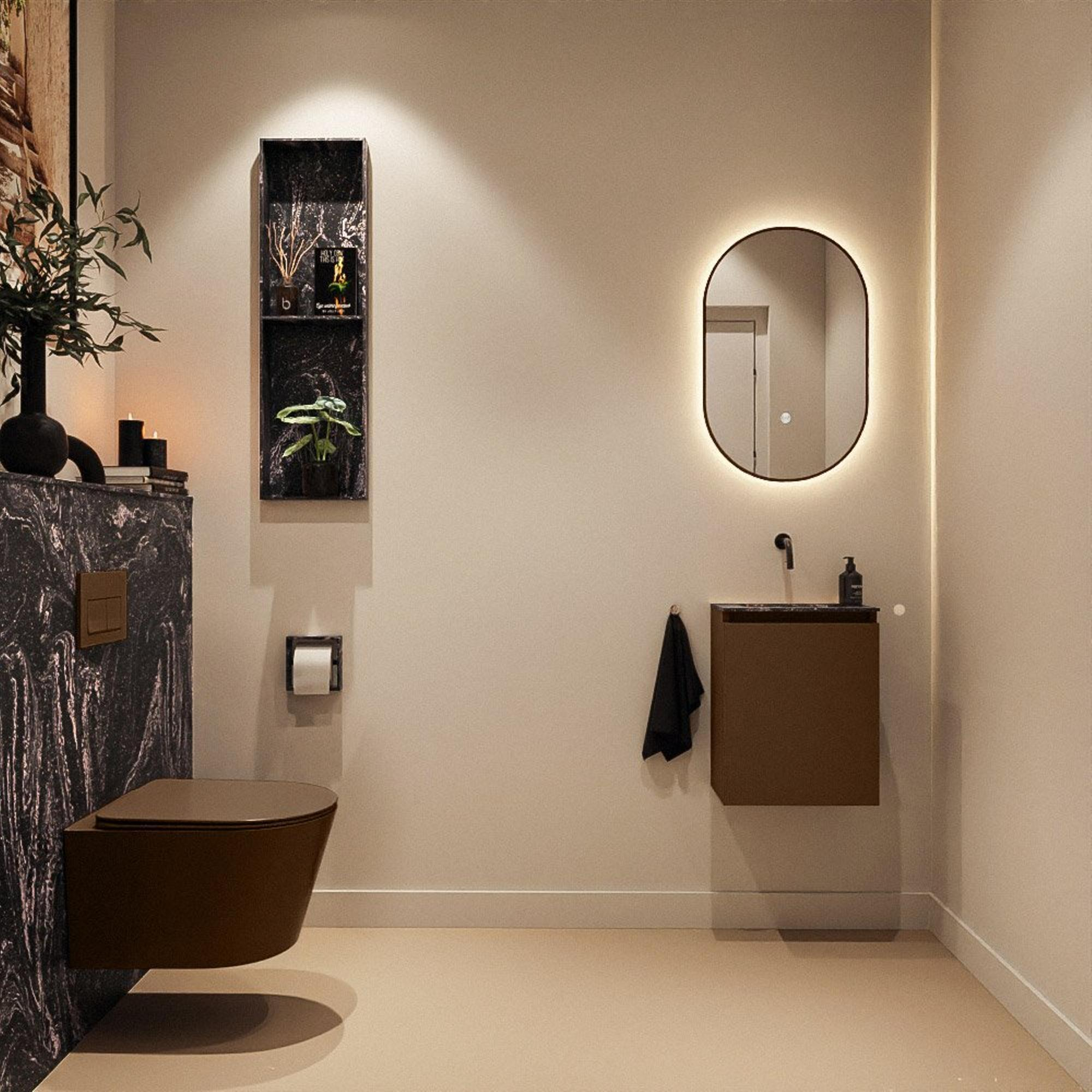 La couleur Rust chaleureuse du meuble crée une apparence naturelle et accueillante, tandis que le lavabo Eden noir en teinte Lava ajoute une touche de luxe. Cette combinaison facilite l’harmonisation de l’ensemble avec des robinets noirs, des accessoires ou des luminaires mats pour un look moderne et cohérent. Les façades lisses sans poignées renforcent le caractère minimaliste et confèrent à vos toilettes ou à votre salle de bains d’appoint une apparence haut de gamme et ordonnée. Ce meuble s’intègre ainsi parfaitement aux styles d’intérieur populaires tels que moderne, industriel et Japandi, et vous permet de faire de vos toilettes une véritable extension de votre concept d’intérieur global.