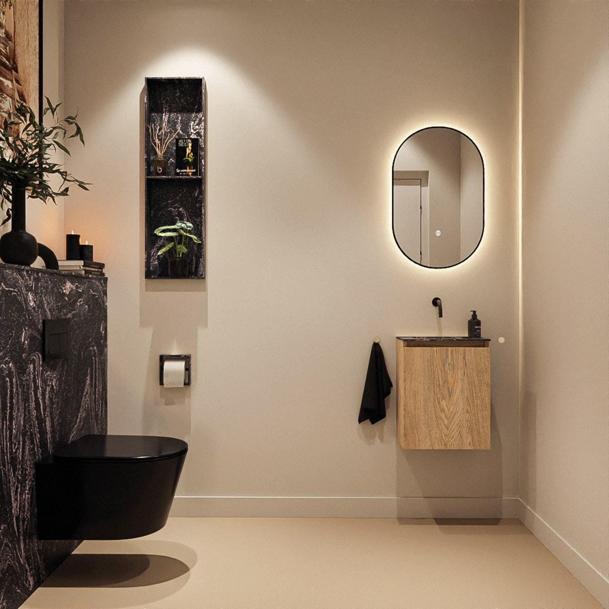 Avec des dimensions de 40x23x50 cm, ce meuble est spécialement conçu pour les toilettes compactes et les petites salles de bains. La faible profondeur fait que le meuble empiète à peine sur l'espace de passage, tout en vous offrant un point d'eau complet. Le lavabo est positionné au centre, ce qui vous permet de raccorder facilement vos conduites et donne une impression de symétrie à l'espace. Comme il n'y a pas de trou de robinet, vous êtes totalement libre de choisir un mitigeur mural correspondant à votre style – idéal si vous souhaitez créer un effet hôtel moderne et épuré. Vous utilisez ainsi chaque centimètre de manière optimale, sans sacrifier le confort ni l'esthétique.