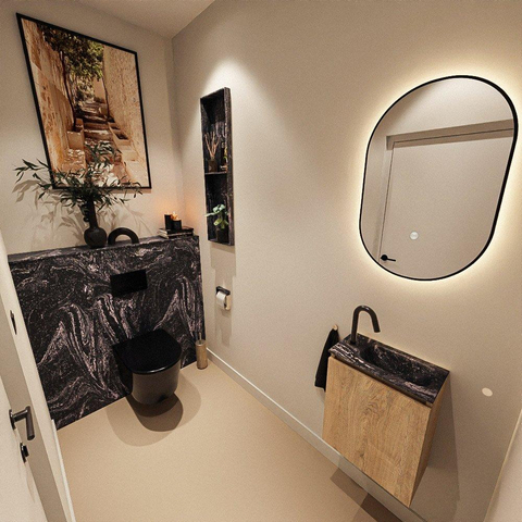 La combinaison de la teinte bois Washed Oak avec le lavabo Eden noir en Lava offre une apparence luxueuse et contemporaine. Le décor bois apporte chaleur et ambiance à vos toilettes, tandis que le lavabo noir forme un accent design chic qui s'accorde parfaitement, par exemple, avec un robinet noir ou des accessoires noirs. Ce mélange moderne se marie à merveille avec des carreaux effet béton, des murs blancs ou au contraire des couleurs marquées. Grâce aux lignes sobres et aux façades sans poignées, l'ensemble reste visuellement léger, même dans un petit espace. Vous créez ainsi, avec un meuble compact, un ensemble haut de gamme et bien pensé.