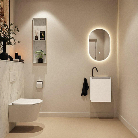 Avec une largeur de 40 cm et une profondeur de seulement 23 cm, ce meuble de WC est idéal pour les petits espaces de la maison. Vous pouvez vous laver les mains confortablement sans que le meuble ne dépasse trop dans la zone de passage, ce qui fait une grande différence en termes de confort, surtout dans un espace WC étroit. La hauteur de 50 cm s’aligne parfaitement avec les WC suspendus standards, ce qui donne un ensemble calme et équilibré. Comme le lavabo est positionné sur le côté droit, ce meuble est particulièrement adapté lorsque l’arrivée d’eau et l’évacuation se trouvent également à droite, ou lorsque votre sens de circulation l’exige. Vous exploitez ainsi au maximum l’espace disponible et évitez les situations gênantes à l’entrée et lors des mouvements de rotation.