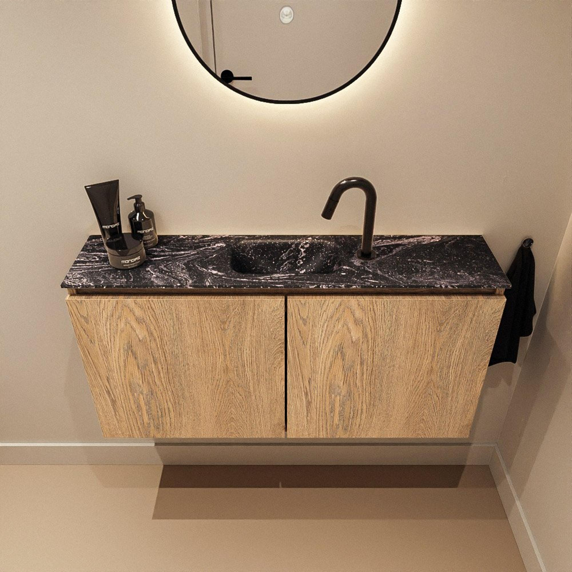 La combinaison de la teinte bois Washed Oak avec le lavabo Eden noir en Lava offre un look contemporain et moderne avec du caractère. La structure du bois apporte chaleur et atmosphère, tandis que le plan noir et le lavabo créent au contraire un contraste épuré et élégant. Cet ensemble s'intègre donc parfaitement dans les styles de salle de bains populaires comme le moderne, l'industriel, le scandinave ou le style hôtel chic. Grâce à son jeu de couleurs, le meuble se combine facilement avec des robinets noirs, des accessoires noirs ou au contraire avec un chrome intemporel pour une touche plus douce. La finition sans poignées renforce le design minimaliste et assure une apparence calme et luxueuse dans vos toilettes ou votre salle de bains.