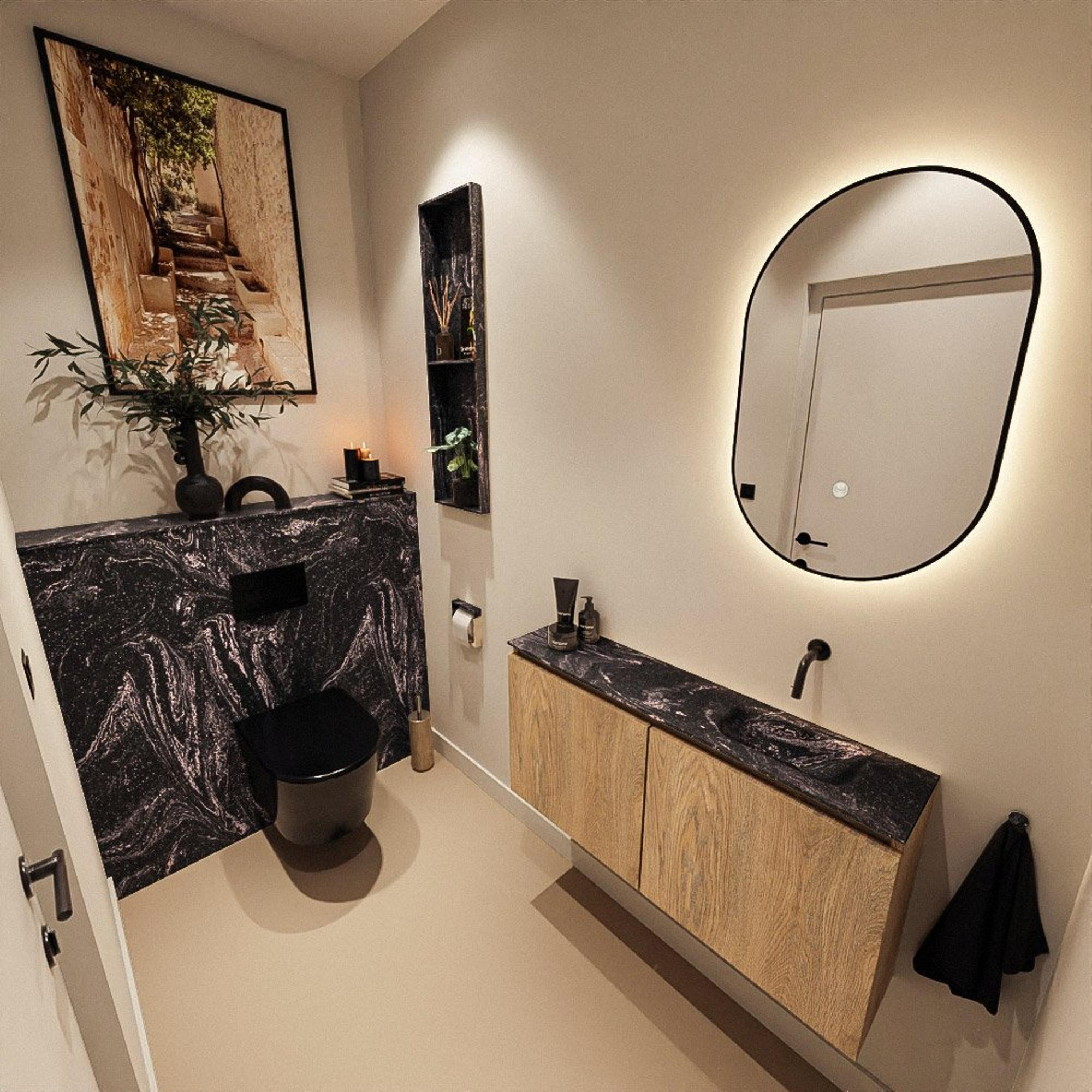 Vous cherchez un meuble élégant et fonctionnel pour vos toilettes ou votre petite salle de bains, sans faire de concessions sur le design et la qualité ? Ce meuble compact combine un aspect bois chaleureux avec des lignes épurées et un luxueux lavabo noir. Grâce à sa faible profondeur, il est idéal pour les espaces étroits, comme un WC, une petite salle de bains ou une niche, où chaque centimètre compte. Dans le même temps, il offre suffisamment d’espace de rangement derrière les portes, de sorte que les petits objets restent hors de vue et que votre espace paraisse toujours bien rangé. La finition moderne sans poignées et le contraste entre le plan noir et le lavabo intégré assurent une apparence haut de gamme, digne d’un hôtel, qui s’intègre facilement dans une salle de bains moderne ou de style scandinave. Avec le lavabo à droite et sans trou de robinet, vous avez en plus toute la liberté de choisir vous-même un robinet mural ou encastré assorti, entièrement adapté à vos goûts et à l’agencement de votre pièce.