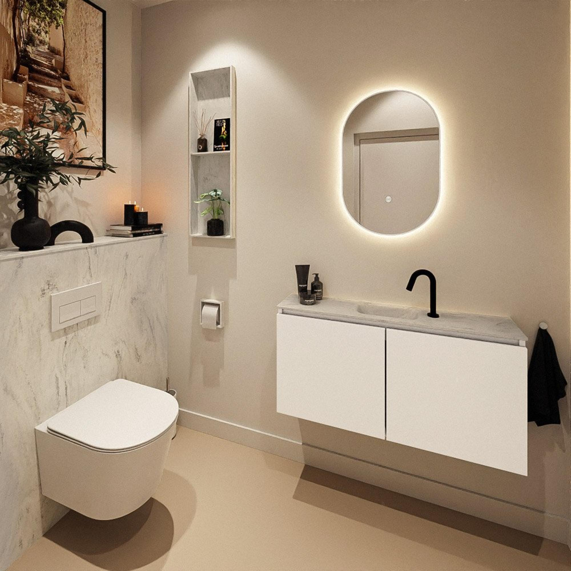 Avec une profondeur de seulement 23 cm, ce meuble est idéal si vous disposez de peu d'espace mais ne voulez pas faire de concessions sur le confort. La largeur de 100 cm vous offre un plan de lavabo généreux, tandis que la faible profondeur évite que le meuble ne dépasse trop dans la pièce. Cela rend cet ensemble parfait pour les toilettes étroites, les petites salles de bains ou une niche le long d'un passage. La position centrale du lavabo assure une ligne de circulation naturelle et rend l'utilisation intuitive : vous entrez, ouvrez le robinet et disposez encore de chaque côté d'espace pour, par exemple, un distributeur de savon ou une décoration. Vous combinez ainsi le gain de place avec une sensation d'espace.