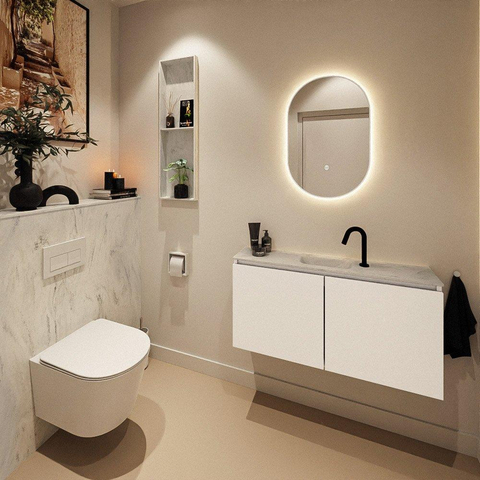 Le meuble de couleur Talc forme une base douce et moderne qui se combine facilement avec des tons blancs, gris et bois. Le lavabo Opalo en Solid Surface y ajoute une touche subtile et luxueuse, avec une apparence calme, légèrement marbrée. Ensemble, ils créent un ensemble intemporel qui ne se démode pas rapidement et s'adapte facilement à différents styles de carrelage. Les façades sans poignées renforcent le design épuré et moderne et rendent l'ensemble visuellement calme - idéal si vous souhaitez que un petit espace paraisse plus grand. Grâce au perçage central pour le robinet, vous pouvez facilement choisir un joli mitigeur de lavabo surélevé assorti et finaliser votre propre style.