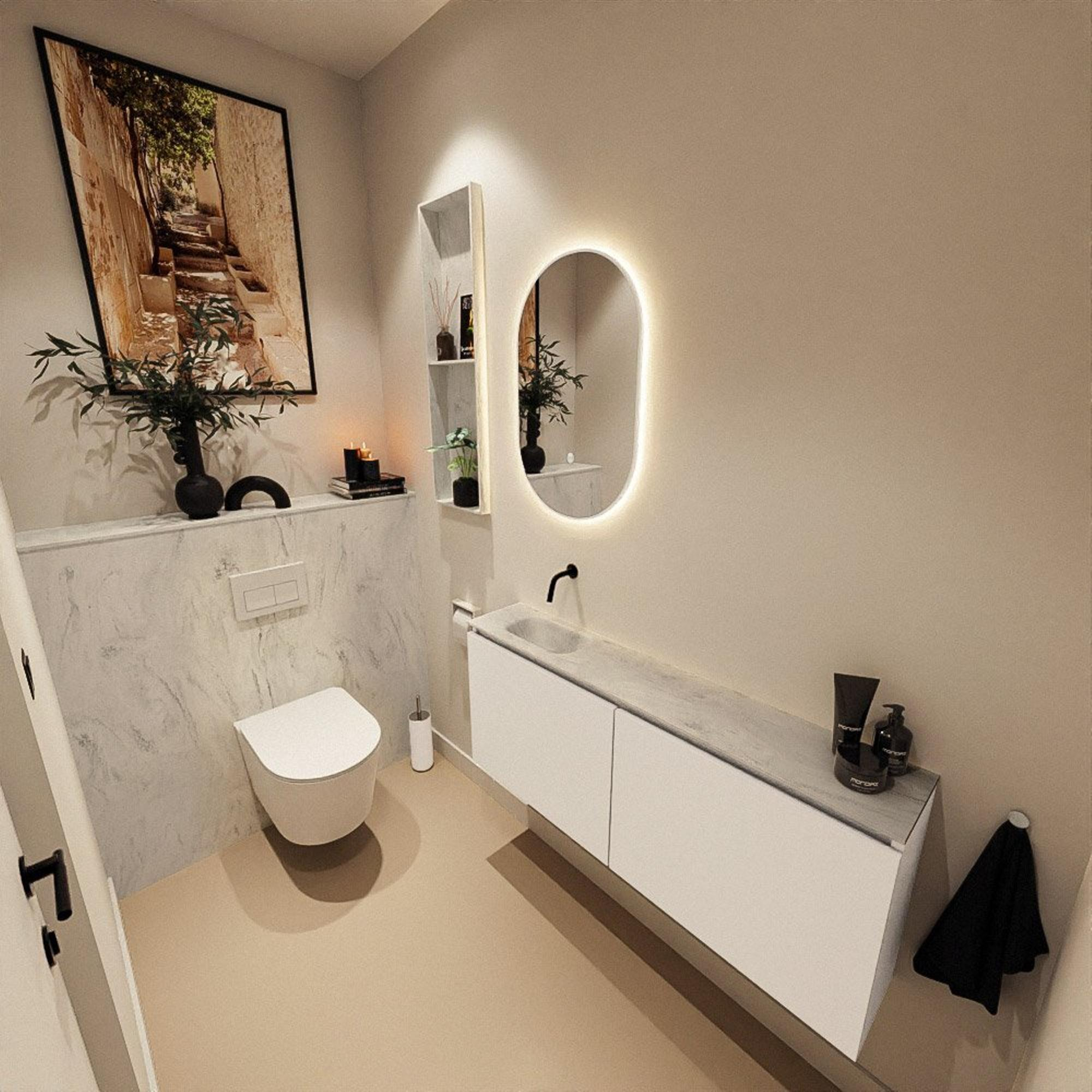 Avec ce meuble WC compact et moderne, vous créez en une seule fois un espace toilettes ordonné et élégant. Grâce à la faible profondeur, c'est une solution idéale pour les toilettes étroites ou les petites salles de bains, tout en bénéficiant d'un espace de lavage généreux et d'un rangement pratique derrière les portes. La combinaison d'un meuble épuré dans une couleur douce et claire avec un lavabo minimaliste crée une apparence calme et luxueuse qui s'adapte bien aux intérieurs modernes, scandinaves ou style hôtel chic. Comme le lavabo est positionné sur le côté gauche, ce meuble s'intègre parfaitement lorsque vous souhaitez, par exemple, conserver un passage logique juste à côté de la porte ou d'un mur. Si vous optez pour un robinet mural ou un mitigeur sur plage placé ailleurs, la version sans trou de robinet s'y adapte parfaitement et crée un look particulièrement épuré et haut de gamme.