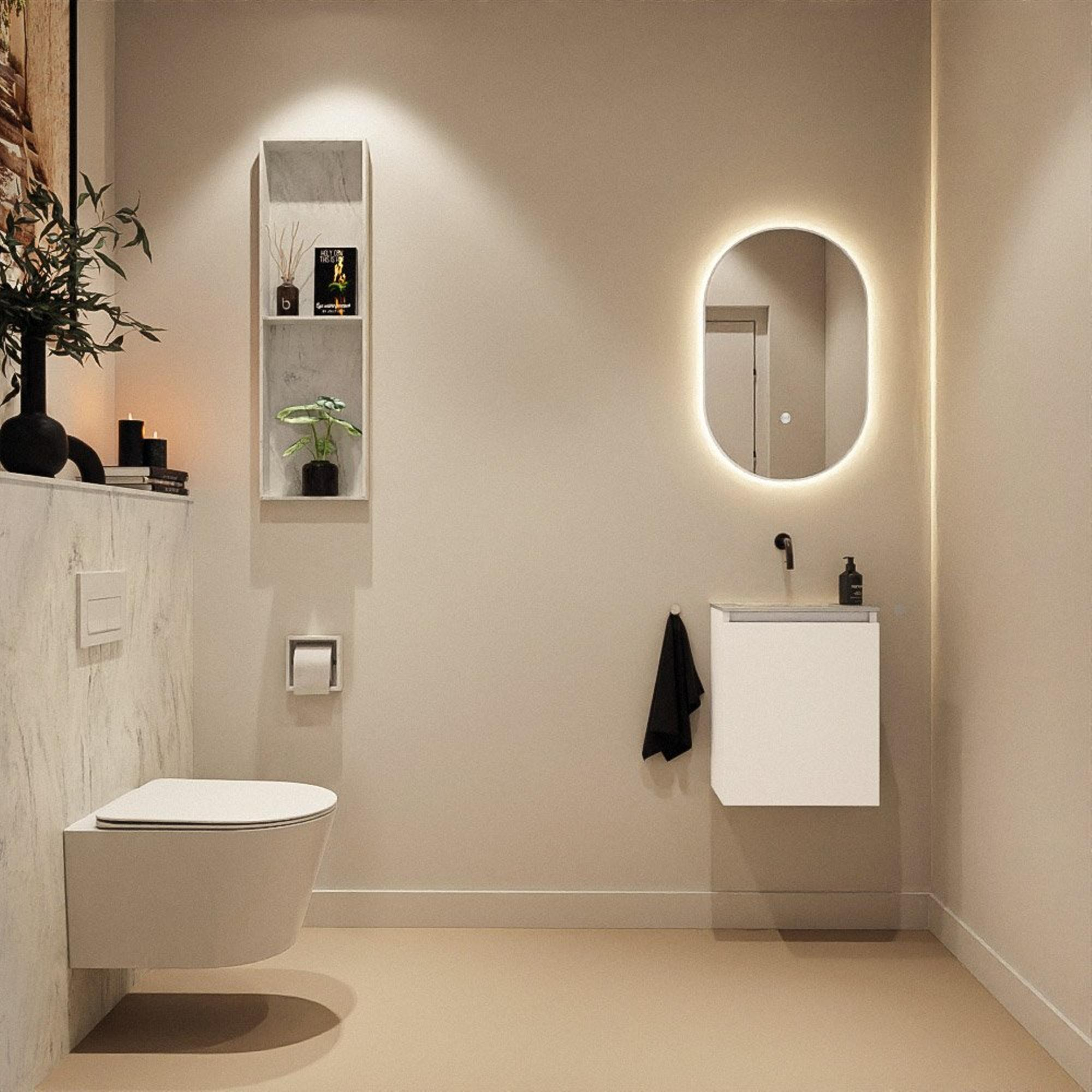 Le meuble bas de couleur Talc constitue une base calme et moderne qui se combine facilement avec d'autres couleurs sanitaires comme le blanc, le noir ou le chrome. Le plan en Solid Surface gris avec lavabo Eden intégré en version Opalo y ajoute une apparence haut de gamme, minérale, comparable à un marbre clair, mais bien plus pratique à entretenir. La transition sans joint entre le plan et le lavabo offre un aspect épuré et évite les rebords difficiles où la saleté pourrait s'accumuler. Comme le lavabo est réalisé sans trou de robinet, vous pouvez opter pour un élégant robinet mural, ce qui renforce encore davantage le look hôtel de luxe de vos toilettes.
