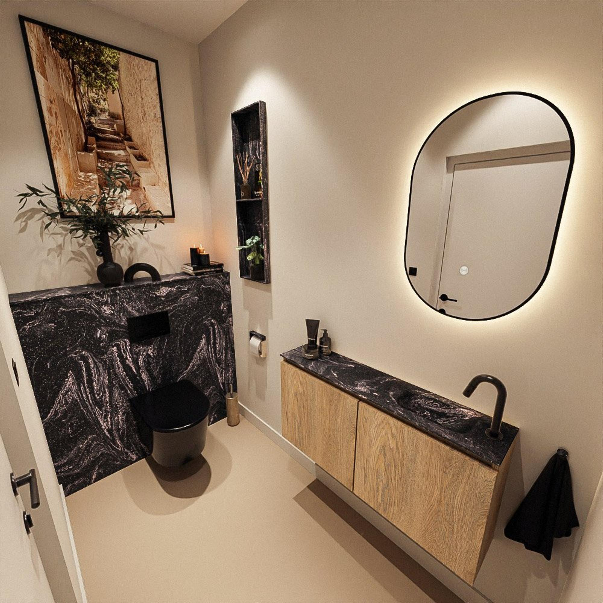 Le meuble en Washed Oak donne à votre pièce une apparence chaleureuse et naturelle, tandis que le plan noir épuré de couleur Lava apporte une touche moderne. Cette combinaison de bois et de noir est très appréciée dans les intérieurs contemporains et se marie parfaitement avec des robinets noirs mats, des accents noirs ou, au contraire, des éléments blancs contrastants. Le plan en solid surface se prolonge sans rupture dans le lavabo, ce qui crée un look épuré et minimaliste sans bords ni joints gênants. La façade sans poignées renforce cette apparence apaisante et est en plus pratique à l’usage : aucune poignée saillante contre laquelle vous cogner dans un espace étroit, mais une finition nette et haut de gamme.