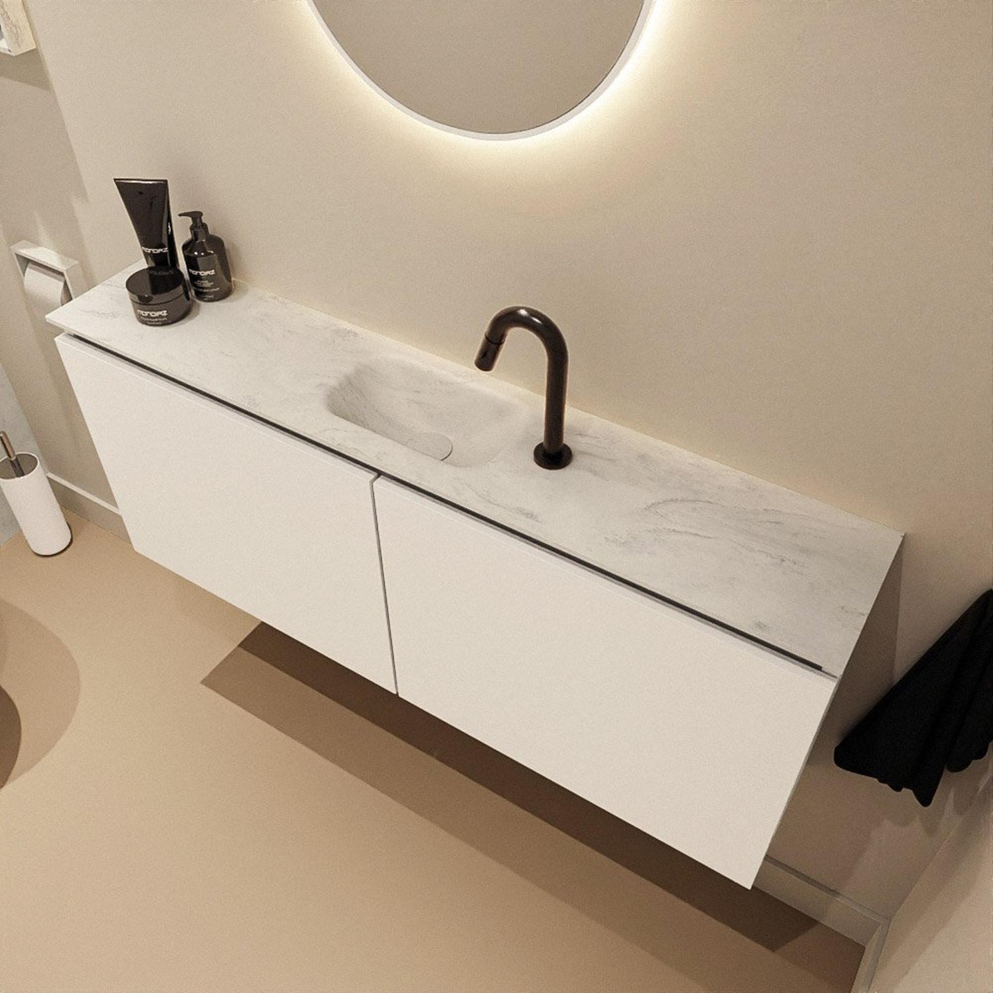 Avec une largeur de 120 cm et une faible profondeur de seulement 23 cm, ce meuble offre une zone de lavage généreuse sans trop empiéter sur l’espace. Idéal lorsque votre WC ou salle de bains est étroit, mais que vous voulez malgré tout pouvoir vous laver les mains confortablement. Les lignes fines et la finition sans poignées contribuent à une image minimaliste et apaisante ; il n’y a pas de poignées saillantes qui gênent ou perturbent la vue. La couleur Talc se marie en outre aisément avec des tons blancs, gris et bois, ce qui vous permet d’intégrer facilement ce meuble aussi bien dans un style moderne, hôtel chic, que dans un décor plus naturel de type scandinave.
