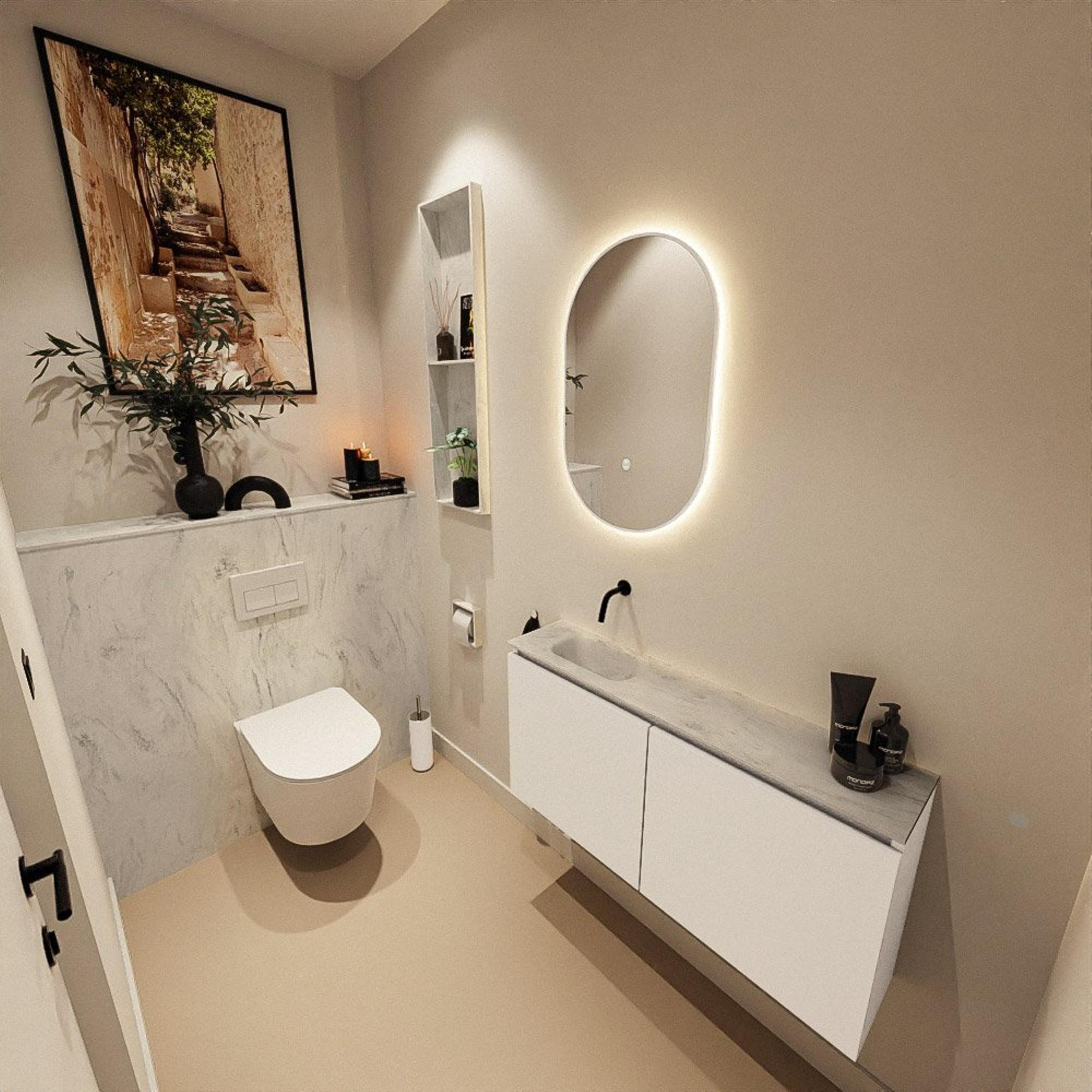Ce set compact et allongé est idéal pour un WC moderne ou une petite salle de bains où vous souhaitez un peu plus de confort et d’espace de rangement sans que la pièce paraisse encombrée. Avec une faible profondeur, le passage reste large, tout en disposant d’un lavabo complet avec tablette. La combinaison d’un meuble aux lignes épurées dans la couleur Talc avec une vasque Solid Surface dans une teinte grise douce s’accorde parfaitement avec les styles d’intérieur contemporains tels que hôtel chic, minimaliste ou scandinave. Grâce à la position du lavabo à gauche, un plan de toilette plat et pratique se crée à droite pour le savon, les bâtonnets parfumés ou un accessoire décoratif. Si vous recherchez un meuble WC qui non seulement a un aspect élégant mais qui est également bien pensé en termes d’agencement, d’hygiène et d’utilisation quotidienne, alors c’est un choix très judicieux.