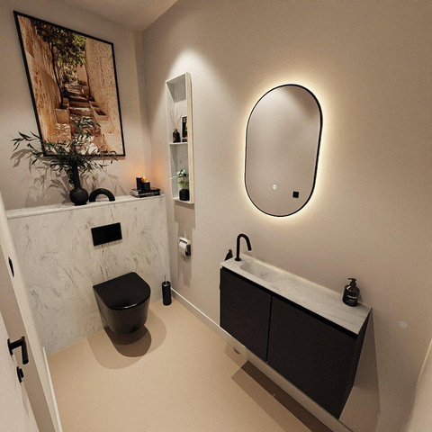 Avec une largeur de 80 cm et une faible profondeur d'environ 23 cm, ce meuble offre exactement l'équilibre entre confort et gain de place. Vous disposez de suffisamment d'espace de plan et de vasque pour vous laver les mains ou poser quelque chose un instant, sans que le meuble n'empiète gênant sur l'espace. La hauteur d'environ 50 cm assure une position ergonomique, surtout en combinaison avec un WC suspendu standard. La vasque est placée à gauche, ce qui rend ce meuble parfait pour les espaces étroits où vous entrez, par exemple, par un côté. Vous évitez ainsi les chocs avec les portes ou les genoux et vos toilettes paraissent immédiatement plus calmes et mieux pensées.