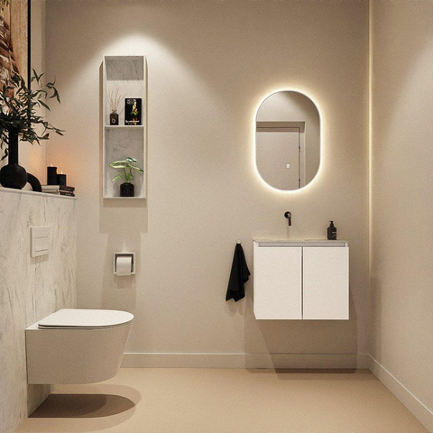 La couleur de meuble Talc appartient au groupe des blancs et offre une base fraîche et moderne qui se combine facilement avec d’autres couleurs de sanitaires. Le lavabo Opalo en blanc marbré clair y ajoute une touche de luxe subtile : l’effet marbre a une allure chic, tout en restant discret et intemporel. Le plateau est en solid surface, un matériau haut de gamme à l’aspect épuré qui s’intègre parfaitement dans les salles de bains modernes et design. Grâce à la façade sans poignée, le design reste minimaliste et sobre, sans interruption de lignes ni poignées gênantes. Vous créez ainsi une ambiance calme, exactement ce que l’on recherche dans un petit espace.