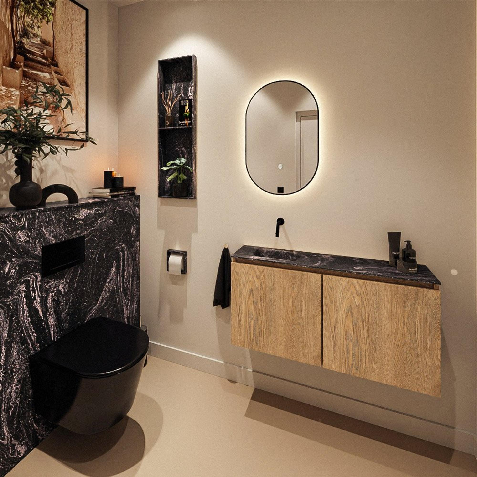La combinaison de la teinte bois Washed Oak et du plan noir épuré confère immédiatement à vos toilettes une apparence contemporaine et haut de gamme. Les portes sans poignées créent une façade sobre et minimaliste, sans interruptions gênantes. Grâce à la largeur de 100 cm du meuble, un joli jeu de lignes horizontales se crée, donnant à votre espace une impression de grandeur. Le style moderne se marie facilement avec des robinets noirs ou mats, des carreaux en céramique et des murs clairs ou foncés. Vous créez ainsi, avec relativement peu d’éléments, un look luxueux et réfléchi, comme si vous entriez dans un hôtel-boutique.