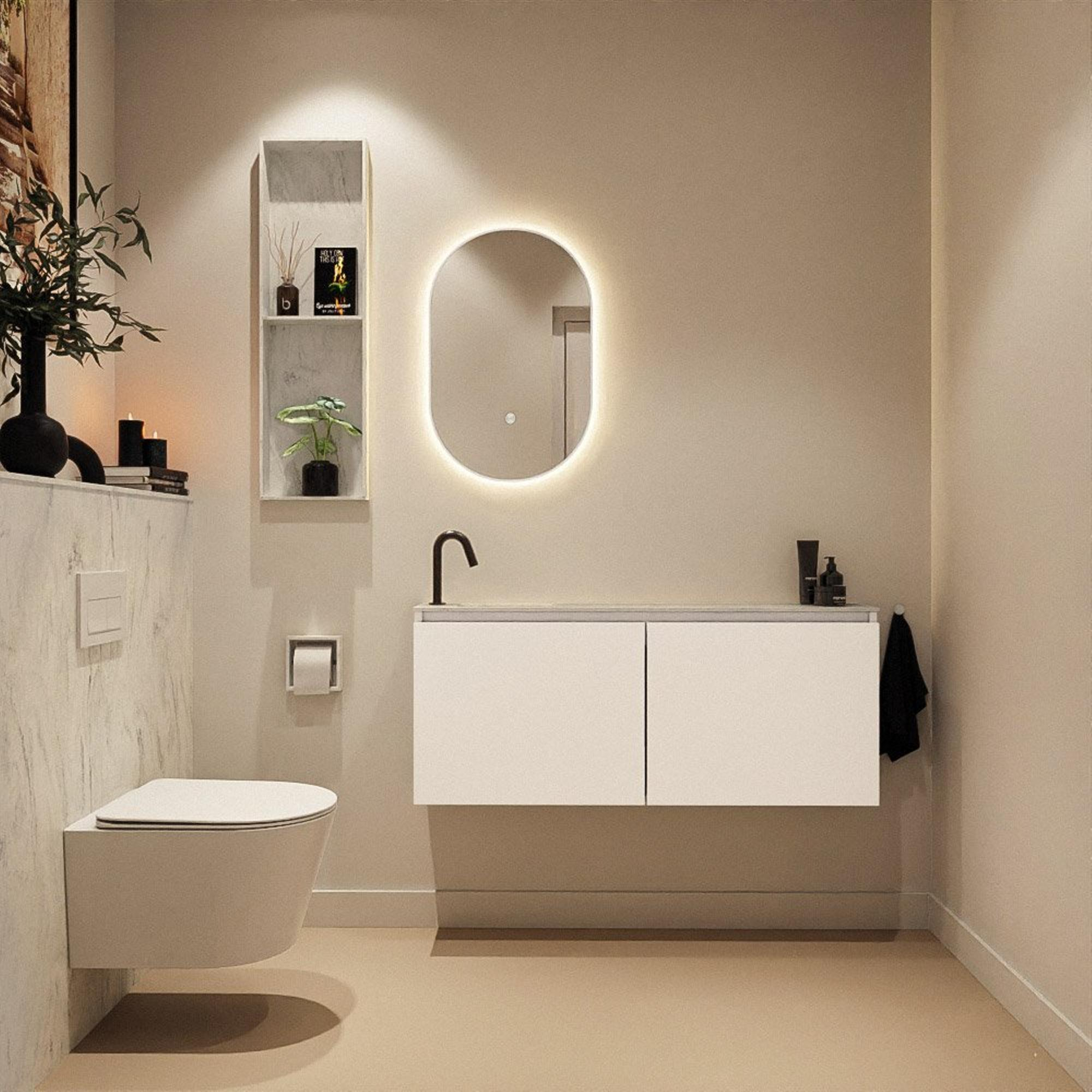 Avec ce meuble WC épuré, vous créez en une seule fois du calme, un confort supplémentaire et un aspect luxueux dans vos toilettes. Grâce à la conception peu profonde, il s'intègre sans effort aussi bien dans les petits WC que dans les passages étroits, sans que vous ne perdiez de surface de travail ou de facilité d'utilisation. La combinaison d'un meuble minimaliste et d'une vasque solide le rend particulièrement adapté aux intérieurs modernes, mais il trouve également parfaitement sa place dans un style sobre et intemporel. Si vous cherchez une solution pratique avec suffisamment d'espace de dépose, une position de robinet bien pensée et une finition de haute qualité qui reste belle pendant des années, c'est un choix très judicieux. Surtout si vous aimez le design épuré, les façades sans poignées et les tons naturels doux qui donnent immédiatement à vos toilettes une atmosphère calme et soignée.