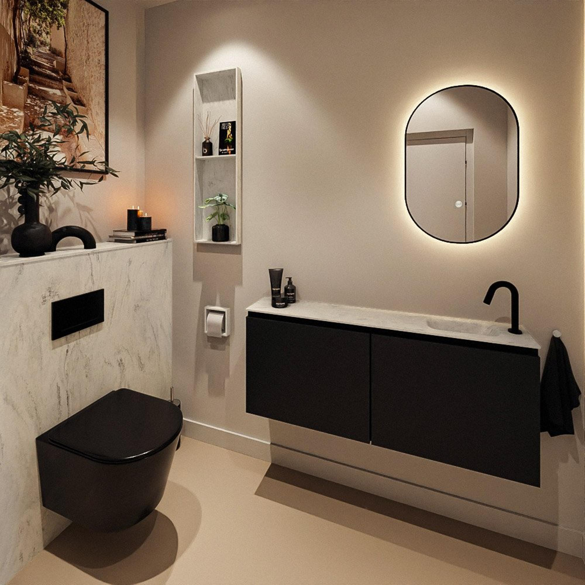 Avec une largeur de 120 cm et une faible profondeur de seulement 23 cm, vous exploitez au maximum l’espace disponible, sans empiéter sur la zone de circulation. C’est justement dans les toilettes que ces quelques centimètres de différence sont souvent déterminants pour la sensation d’espace. Grâce à la position du lavabo à droite, vous conservez un agencement logique : vous entrez, vous vous tournez facilement vers le meuble et vous avez immédiatement tout à portée de main. Les deux portes offrent un espace de rangement pratique pour, par exemple, le papier toilette, les produits d’entretien ou les serviettes invité, de sorte que vos toilettes paraissent toujours calmes et ordonnées. La pose murale libère en outre davantage de sol, ce qui donne non seulement une impression plus spacieuse, mais rend également le nettoyage bien plus facile.