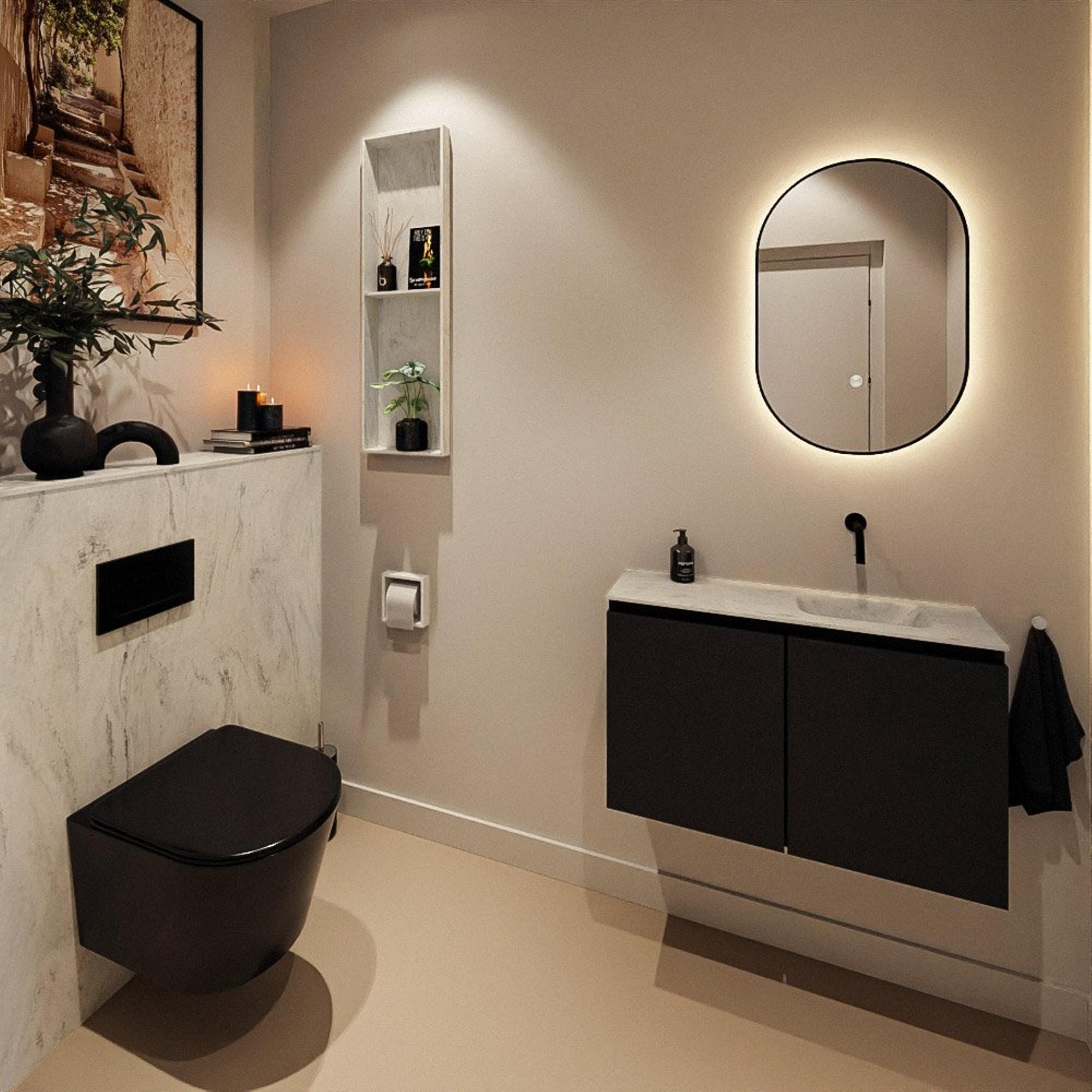 Avec ce meuble de toilettes compact mais ingénieusement conçu, vous créez en une seule fois un espace de rangement supplémentaire et un lavabo élégant dans vos toilettes ou votre petite salle de bains. Grâce à sa faible profondeur, il s'intègre même dans les couloirs étroits ou les toilettes compactes, tandis que son design épuré s'harmonise parfaitement avec les intérieurs modernes. Le meuble dans la chaleureuse couleur Urban se combine avec un lavabo gris intemporel, ce qui vous permet d’associer facilement plusieurs styles et types de carrelage. Idéal si vous recherchez un look calme et minimaliste sans faire de compromis sur la fonctionnalité, par exemple dans une construction neuve, une maison des années 30 rénovée ou des toilettes d'inspiration hôtel de luxe à la maison.