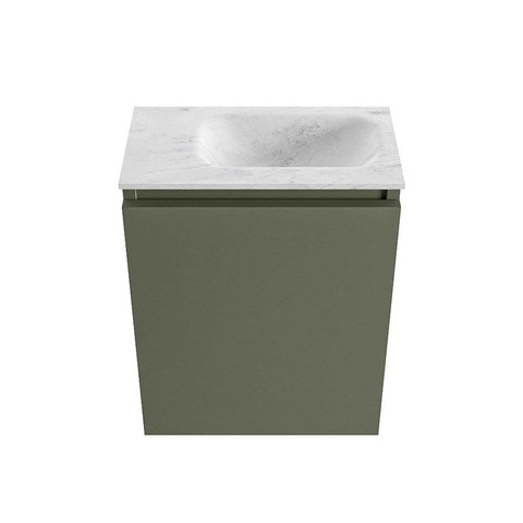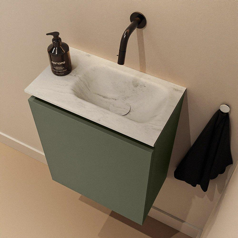Vous recherchez un meuble compact mais luxueux pour vos toilettes ou votre petite salle de bains, à la fois pratique et élégant ? Alors ce meuble de toilettes est un choix judicieux. Grâce à sa faible profondeur, il s'intègre facilement dans les espaces étroits ou le long d'un passage resserré, tout en offrant un véritable lavabo avec espace de rangement. La couleur moderne vert army donne immédiatement du caractère à votre espace et se marie à merveille avec des robinets et accessoires noirs, dorés ou en acier inoxydable. Le lavabo moderne en solid surface avec exécution sans trou de robinet à droite présente un aspect minimaliste et offre suffisamment d'espace pour se laver confortablement les mains, sans que le meuble ne déborde trop dans la pièce. Idéal pour des toilettes invités, une deuxième salle de bains ou tout endroit où vous souhaitez optimiser l'espace sans rien sacrifier à l'esthétique ni à la qualité.