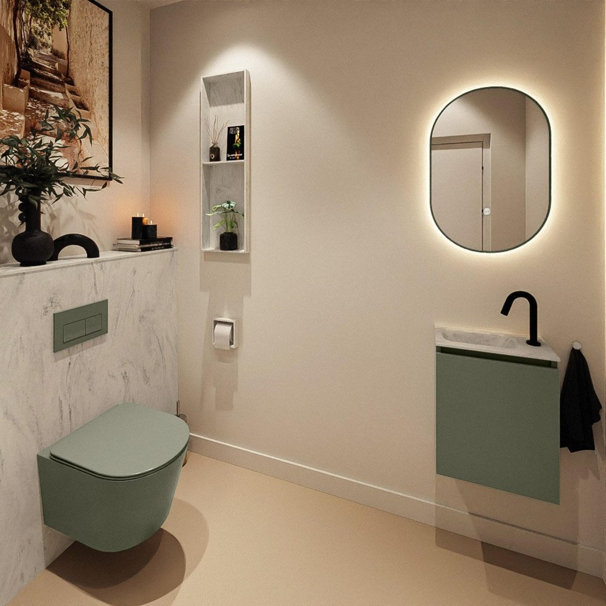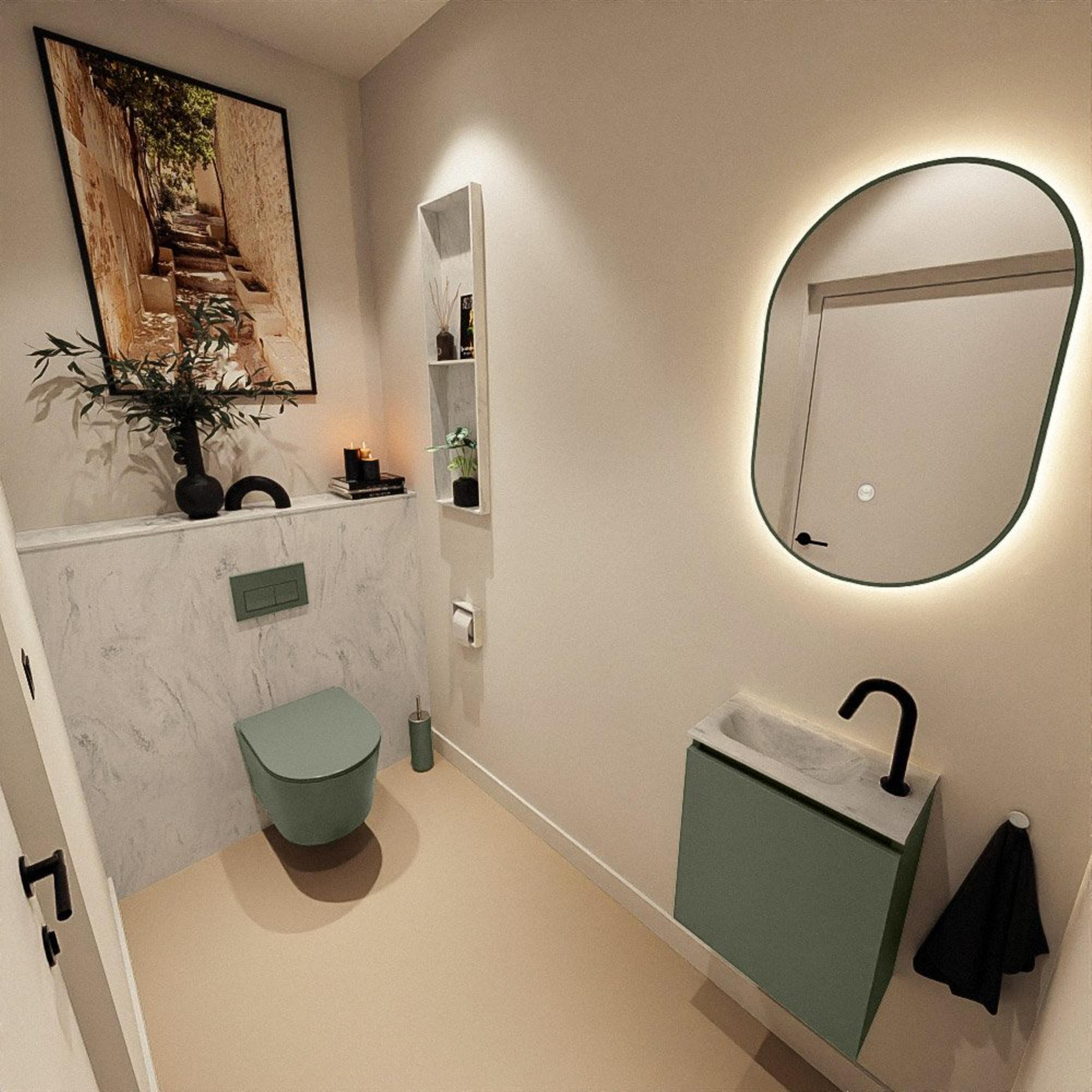 La couleur Army du meuble donne immédiatement du caractère à vos toilettes : une teinte moderne, tirant sur le vert, qui se marie bien avec des murs blancs, des tons bois chaleureux et des robinets noirs ou en laiton. Le lavabo de la série Eden en couleur Opalo crée un contraste élégant ; le plateau en solid surface gris a un aspect luxueux et est agréable au toucher. Cette combinaison est parfaite si vous souhaitez créer un look moderne et design sans que l’ensemble ne devienne trop voyant ou chargé. En optant pour ces couleurs calmes et naturelles, vous pouvez facilement compléter la décoration avec des accessoires, tels que des serviettes, un distributeur de savon ou un miroir assorti, afin d’obtenir un ensemble harmonieux.