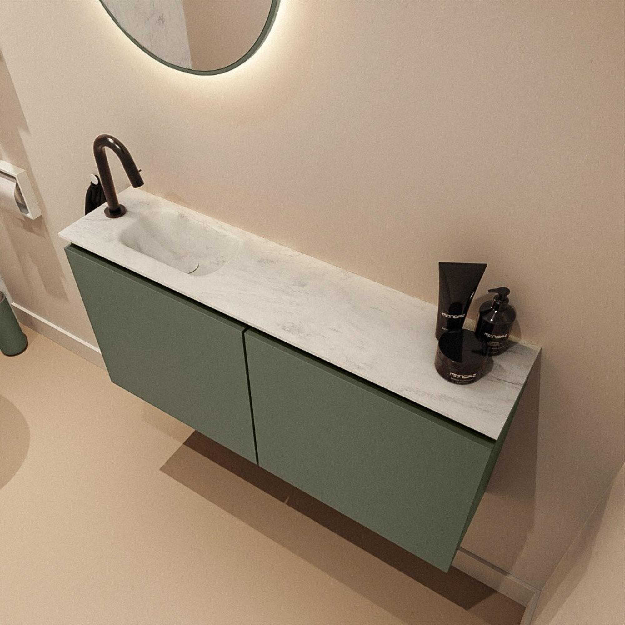 La couleur Army confère au meuble une apparence naturelle et apaisante qui s’intègre parfaitement dans les salles de bains et toilettes modernes. Il s’agit d’une douce teinte verte qui se marie bien avec des carreaux blancs, un aspect béton, des accents en bois ainsi qu’avec des robinets noirs ou en laiton. Grâce au design sans poignées, l’ensemble est sobre et minimaliste, sans surcharge visuelle inutile. Les deux portes s’ouvrent en douceur et offrent une façade calme, de sorte que l’attention se porte automatiquement sur le beau lavabo et votre robinet. Ce meuble est donc particulièrement adapté si vous souhaitez créer un ensemble harmonieux dans lequel la couleur, le matériau et la forme se renforcent mutuellement.