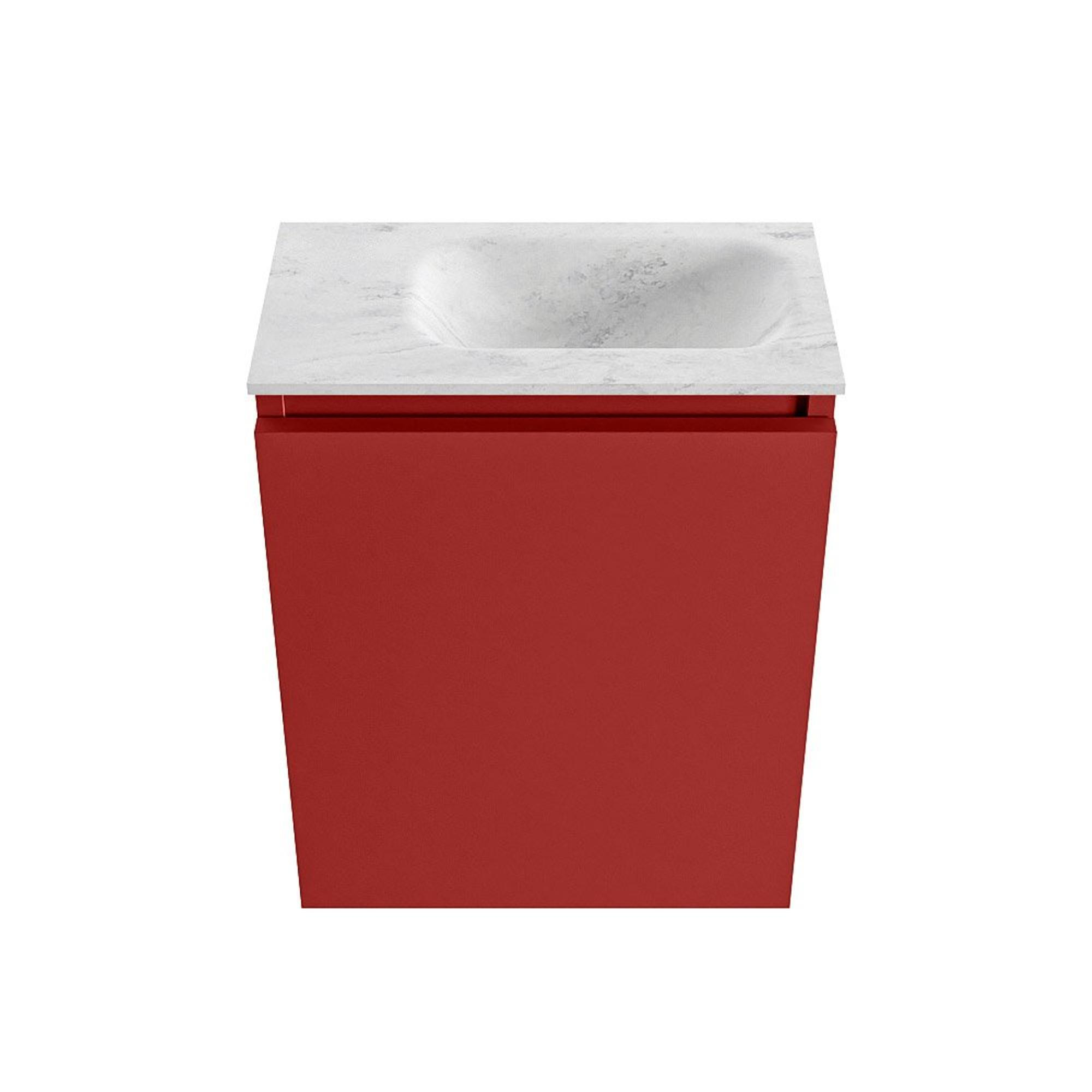 La couleur Fire de la façade et du caisson confère au meuble une apparence moderne et affirmée, avec une teinte rouge chaleureuse qui apporte immédiatement du caractère à vos toilettes. Le lavabo Eden en coloris Opalo arbore un aspect marbré gris clair, créant ainsi un contraste chic avec le meuble situé en dessous. Cette combinaison s’intègre parfaitement dans un environnement de salle de bains moderne ou design, mais peut également constituer un accent marquant dans un intérieur par ailleurs sobre. La finition sans poignée assure un ensemble épuré et minimaliste, sans poignées saillantes, ce qui est non seulement esthétique mais aussi particulièrement pratique dans un petit espace. Vous faites ainsi de vos toilettes une véritable carte de visite de votre maison.
