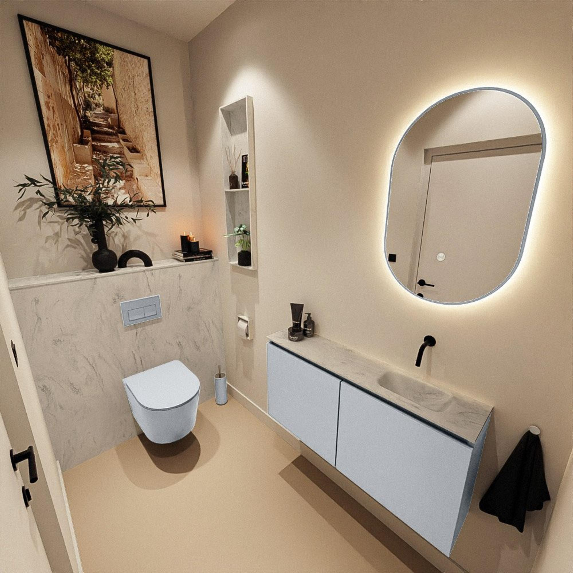 Si vous recherchez un meuble de toilettes épuré et compact, à la fois pratique et élégant, cet ensemble est un choix judicieux. Grâce à sa faible profondeur, il s'intègre facilement dans les petits WC, les niches étroites ou une salle de bains compacte, tout en offrant une véritable solution de lavage. La couleur moderne Clay et le plan de vasque gris s'harmonisent parfaitement avec les intérieurs contemporains, du minimaliste au style hôtel chic. La vasque est positionnée sur le côté droit, ce qui rend ce meuble idéal si vous avez par exemple une porte à gauche ou si vous souhaitez conserver davantage d'espace de passage. Comme il n'y a pas de trou de robinet dans la vasque, vous pouvez l'associer parfaitement à un élégant petit robinet de lavabo mural. Vous créez ainsi une apparence sobre et luxueuse, sans faire de compromis sur la facilité d'utilisation.