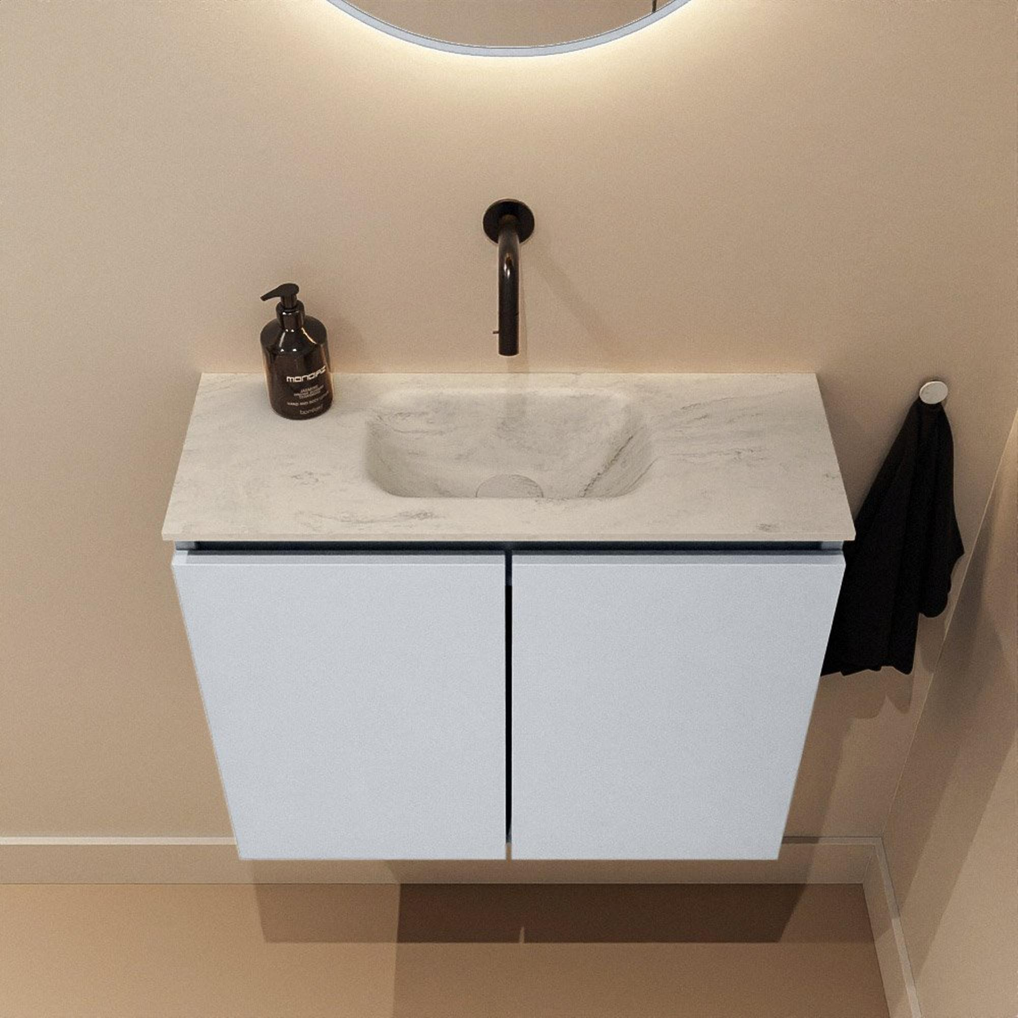 Avec une largeur de 60 cm et une faible profondeur de seulement 23 cm, ce meuble est spécialement conçu pour les petits espaces. Vous disposez d’une surface de dépose suffisante et d’une vasque confortable, mais le meuble empiète à peine sur l’espace. Cela permet de se déplacer agréablement dans vos toilettes ou votre petite salle de bains, sans se cogner constamment contre le meuble. Les deux portes vous offrent en plus un espace de rangement pratique pour, par exemple, du papier toilette supplémentaire, des produits d’entretien ou des serviettes invité, afin que tout reste discrètement hors de vue. Grâce à l’exécution sans poignées, l’ensemble paraît épuré et calme, ce qui crée un effet visuel plus spacieux. Vous créez ainsi, avec un meuble relativement compact, un espace toilettes ordonné et bien pensé.