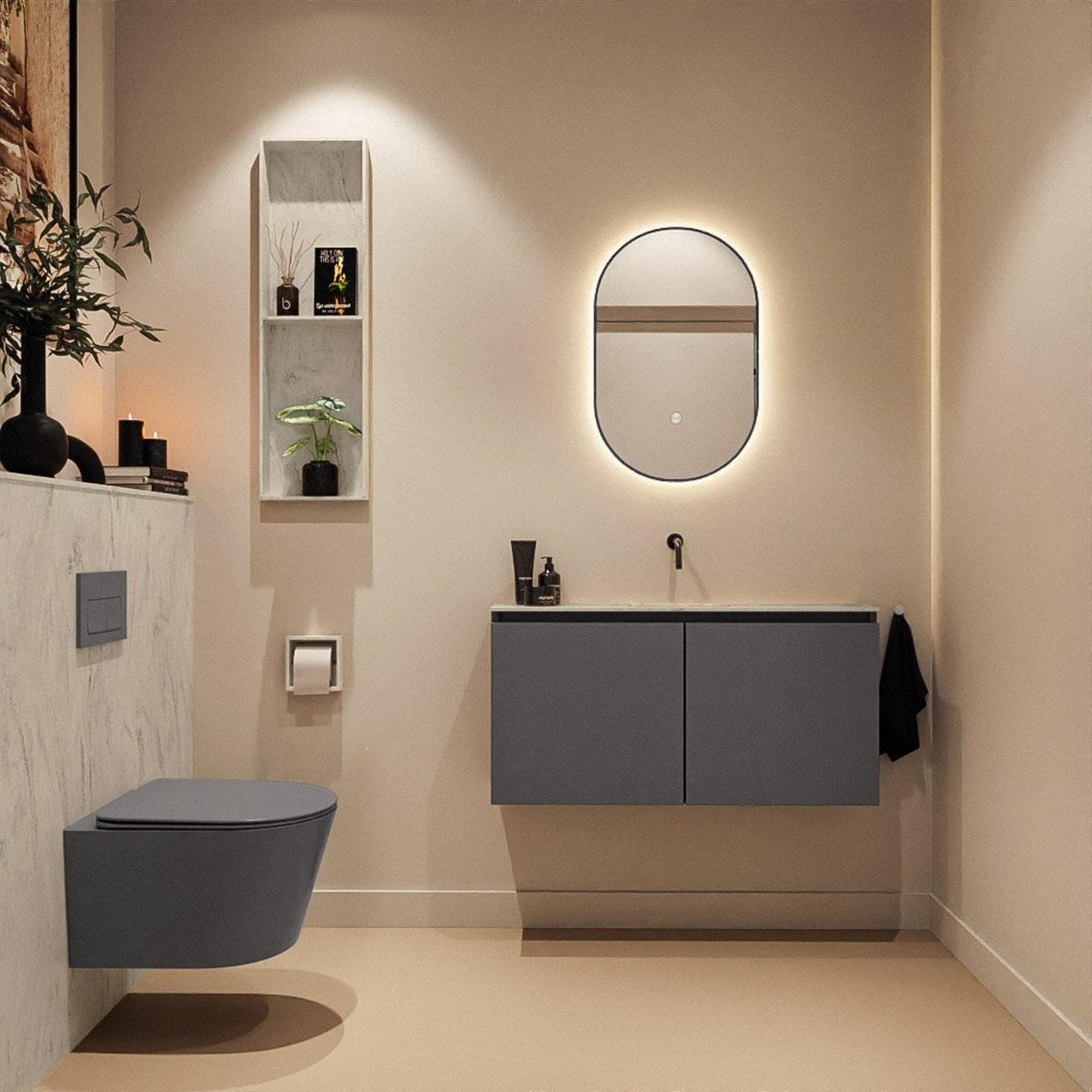 Avec une largeur de 100 cm et une profondeur de seulement 23 cm, vous créez une zone de lavabo généreuse sans perdre d’espace de circulation précieux. La faible profondeur rend ce meuble parfait pour les toilettes étroites, les appartements en ville ou les salles de bains d’appoint où chaque centimètre compte. Grâce à la pose suspendue, le sol paraît plus dégagé et vos toilettes ou votre salle de bains restent claires et aérées. Les portes doubles offrent en plus une façade sobre, sans désordre visible ; idéal si vous souhaitez créer un style ordonné et minimaliste. Le jeu de lignes épurées et la finition sans poignée s’harmonisent parfaitement avec un intérieur moderne avec, par exemple, des accents noirs, un effet béton ou de grands carreaux muraux et de sol gris.