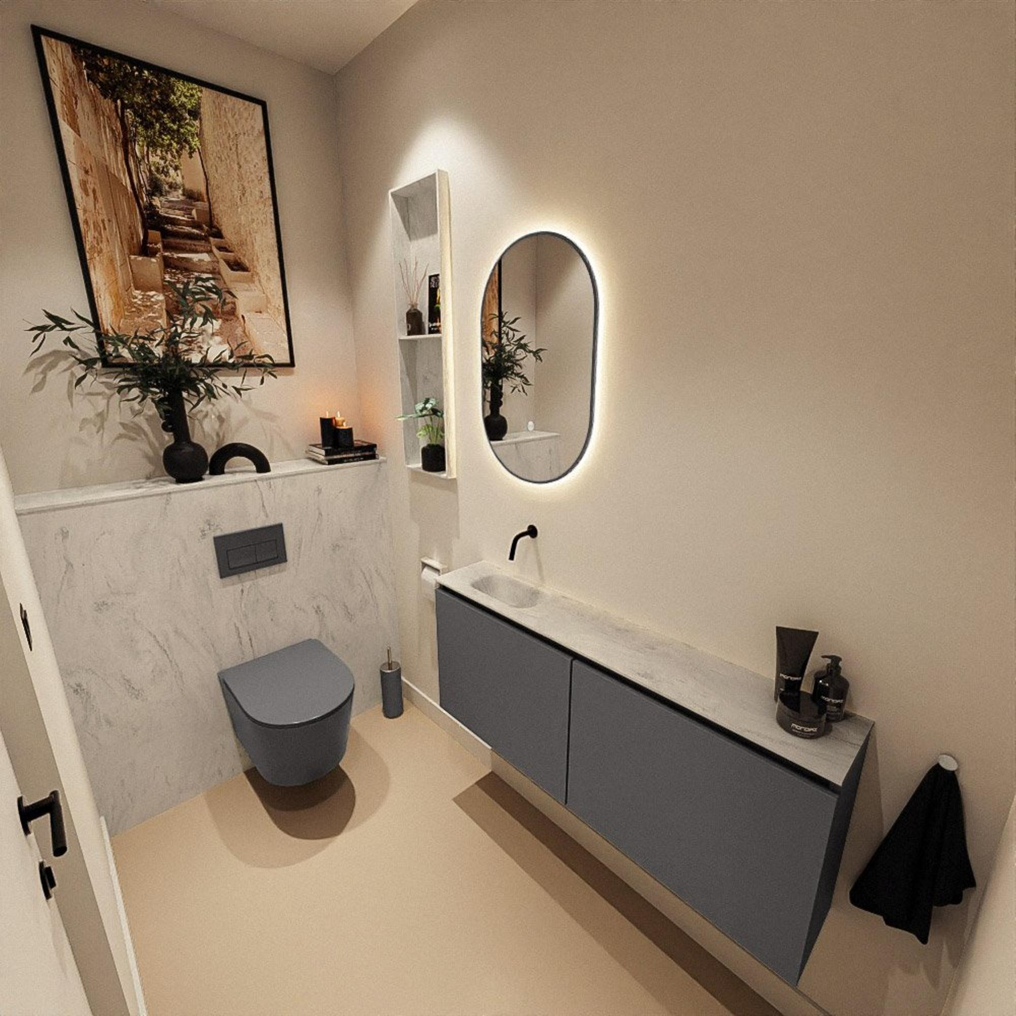 Si vous recherchez un meuble de toilettes épuré et moderne qui prend peu de place tout en offrant un aspect généreux et une utilisation pratique, cette combinaison est un choix judicieux. Avec sa faible profondeur, il s’intègre parfaitement dans les toilettes étroites ou les petites salles de bains où chaque centimètre compte, sans que vous deviez renoncer au confort. La couleur foncée apporte immédiatement une apparence luxueuse, tandis que le fin plan de travail en Solid Surface avec lavabo intégré crée un look minimaliste et apaisant. Grâce au lavabo à gauche, il reste sur la droite un espace de pose supplémentaire pour, par exemple, un distributeur de savon ou une décoration, idéal si vous souhaitez créer un espace ordonné et élégant. Ce meuble est particulièrement adapté si vous aimez le design moderne, les façades sans poignées et un espace de rangement fermé et soigné derrière des portes plutôt que des niches ou tiroirs ouverts visibles.