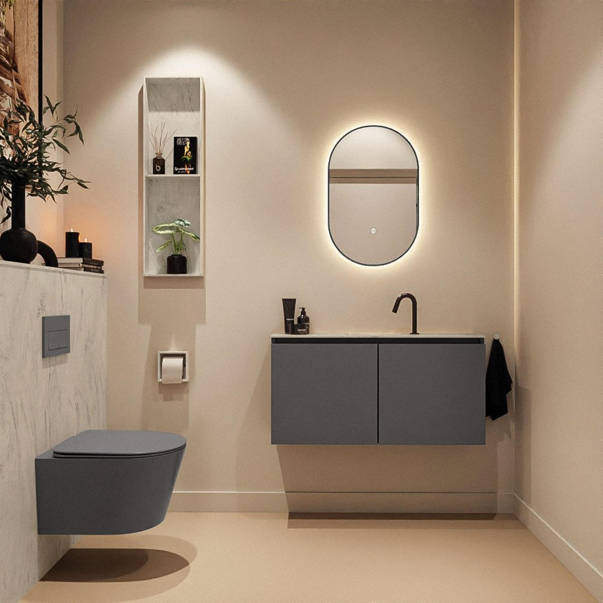 La combinaison du meuble Dark Grey avec la vasque Opalo à l’aspect légèrement marbré crée un contraste fort mais intemporel. Le meuble en MDF sombre s’accorde parfaitement avec les tons gris modernes, les robinets noirs et autres accessoires de salle de bains minimalistes, tandis que le plan en Solid Surface clair rafraîchit et adoucit votre espace. Vous créez ainsi sans effort une ambiance d’hôtel de luxe, même dans un petit espace de toilettes. Grâce à la façade sans poignées, l’ensemble paraît épuré et calme, sans lignes ni poignées gênantes. Ce meuble est donc un excellent choix si vous aimez le style moderne et minimaliste avec juste ce qu’il faut de raffinement supplémentaire.