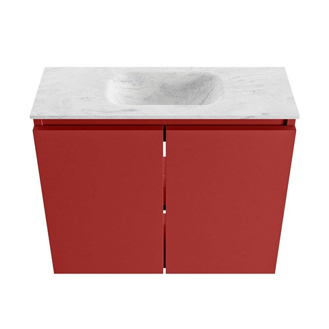 - Meuble bas moderne de couleur Fire, une teinte rouge chaleureuse qui donne immédiatement un aspect design à vos toilettes.