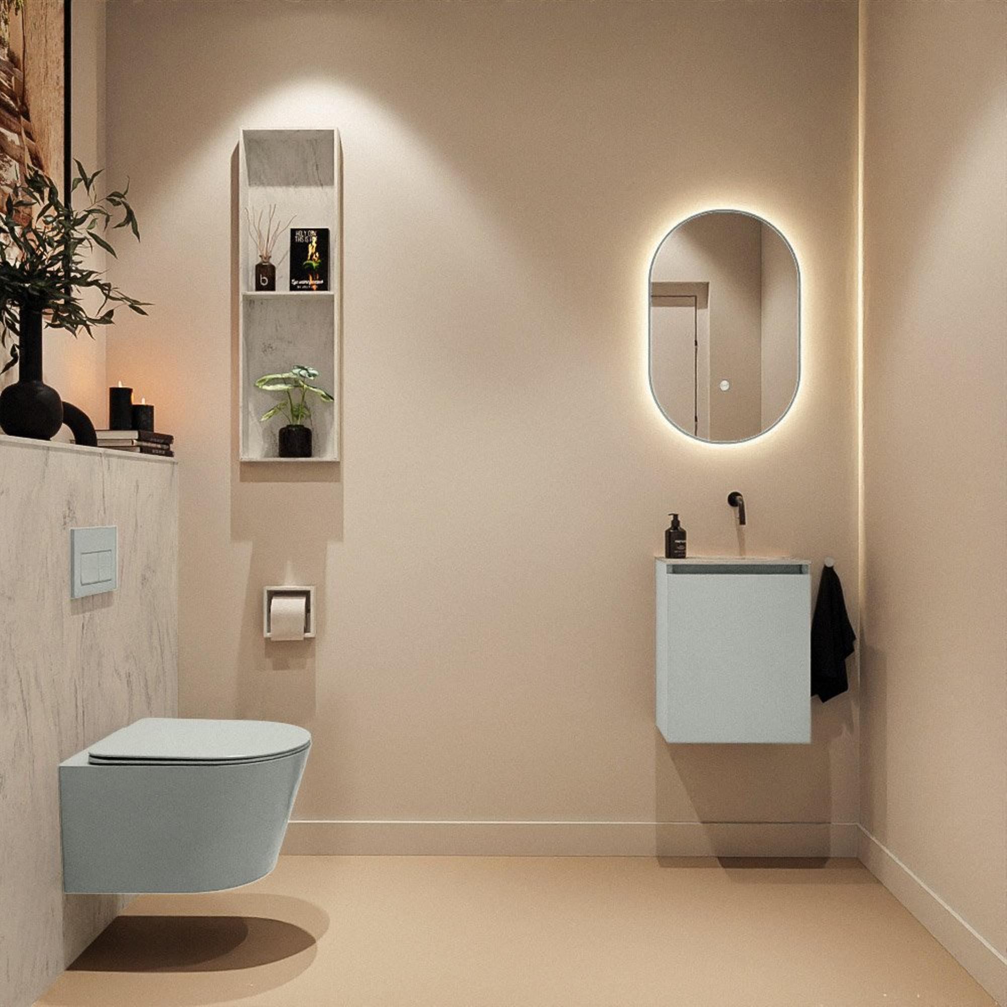 La couleur Greey du meuble offre un aspect élégant et moderne avec une subtile nuance de vert, parfaite si vous voulez autre chose que le blanc ou le bois tout en conservant une atmosphère apaisante. En combinaison avec le lavabo Opalo, un joli contraste se crée entre le meuble coloré et le plan doux et clair. La finition sans poignées assure une façade épurée et minimaliste sans interruption, ce qui convient parfaitement aux toilettes modernes ou orientées design. Grâce à son design intemporel, ce meuble se marie facilement avec différents types de carrelages, ainsi qu’avec des robinets et accessoires noirs ou aspect chrome. Vous créez ainsi aisément un ensemble harmonieux dans vos toilettes.