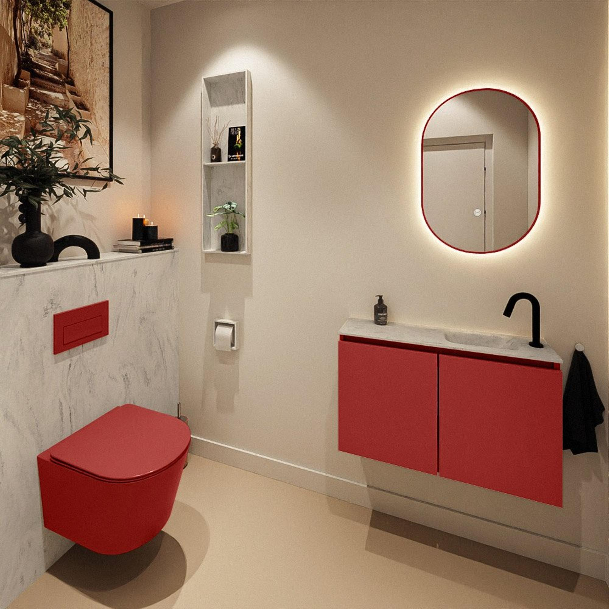 La couleur Fire donne au meuble une apparence chaleureuse et contemporaine qui apporte immédiatement plus d'ambiance et de personnalité à vos toilettes. En combinaison avec le plan en solid surface gris, il se crée un beau contraste qui se marie bien avec des carreaux modernes, des robinets noirs ou d'autres accents design. Grâce à la finition sans poignées, l'ensemble paraît épuré et minimaliste, sans interruption dans la façade. Le style moderne rend cet ensemble parfait pour ceux qui souhaitent des toilettes qui donnent l'impression d'une mini-salle de bains design : sobres, mais pas froides. Associez-le à un miroir assorti et à un beau robinet mural ou sur gorge pour un ensemble complet et harmonieux.