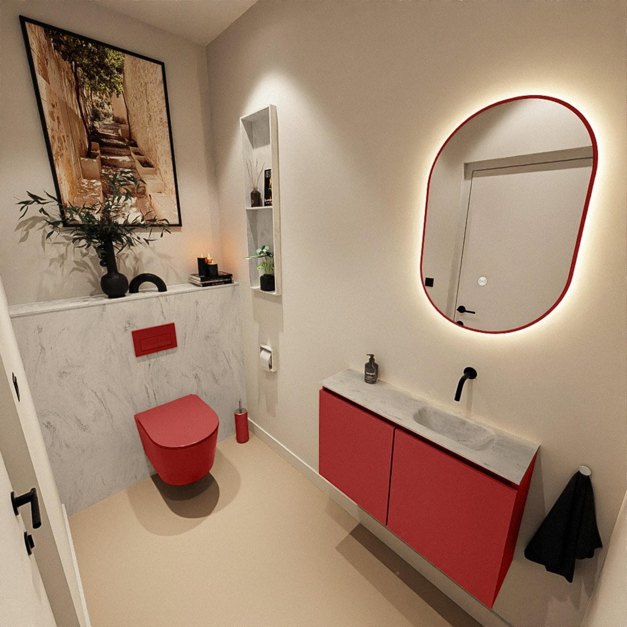 Avec ce meuble de toilette compact, vous créez en une seule fois un aspect net et soigné dans vos toilettes ou votre petite salle de bains. La combinaison d’un meuble élancé avec un plan de lavabo aux lignes épurées le rend particulièrement adapté aux intérieurs modernes où chaque centimètre compte. Grâce à sa faible profondeur, il s’intègre parfaitement dans les espaces étroits ou les petits couloirs d’entrée, sans que vous ne perdiez d’espace de circulation. La teinte rouge chaude apporte une touche élégante, tandis que le lavabo gris sobre assure l’équilibre. Comme le robinet est placé à côté du meuble, le plan lui-même reste épuré et minimaliste. Si vous recherchez un meuble élégant et pratique pour les toilettes invités, un deuxième WC ou une salle de bains compacte, c’est un choix astucieux et peu encombrant.