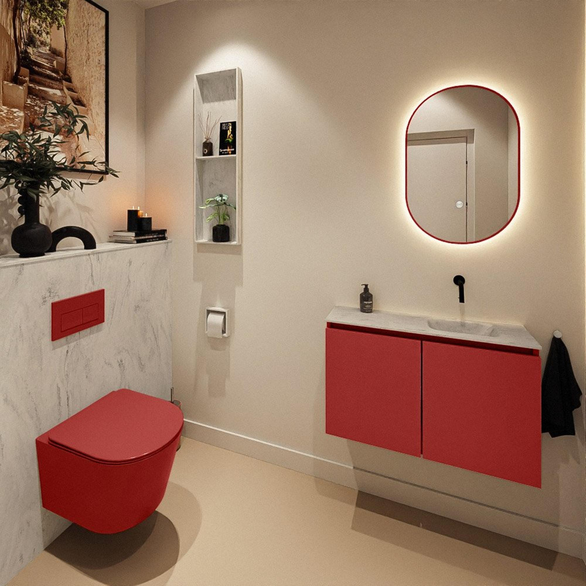 La couleur de façade moderne Fire de la gamme des teintes rouges donne immédiatement du caractère à vos toilettes : chaleureuse, contemporaine et un peu différente du blanc ou du gris standard. Le plan de lavabo aux lignes épurées en coloris Opalo (gris) crée un beau contraste : sobre, minimaliste et facile à combiner avec des robinets et accessoires noirs, chromés ou en métal brossé. Comme le plan est réalisé en solid surface, l’ensemble paraît sans joint et luxueux, idéal si vous souhaitez créer un style digne d’un hôtel dans un espace compact. La finition sans poignées renforce le design minimaliste, ce qui donne à l’ensemble une apparence épurée et raffinée.
