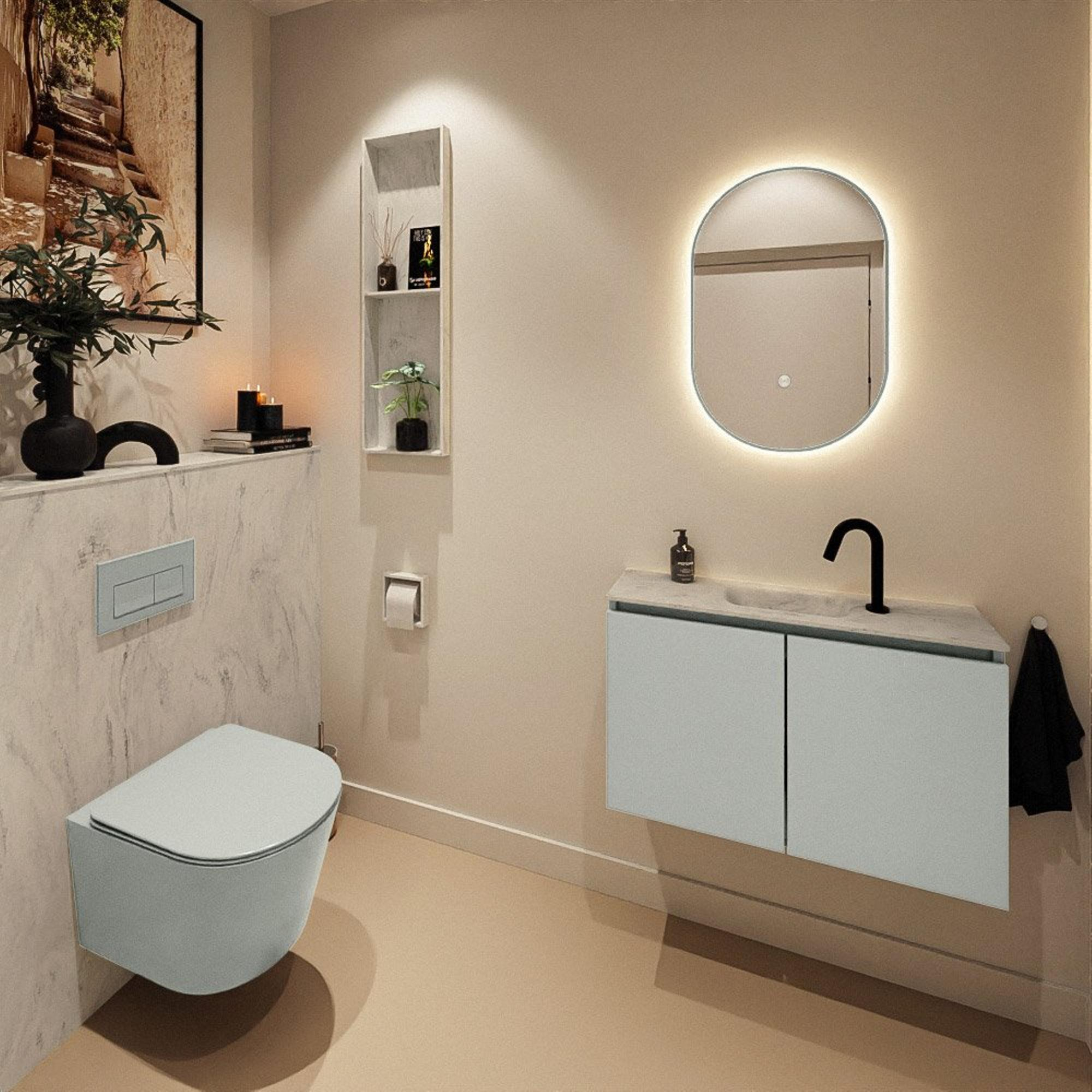 Avec une largeur de 80 cm et une faible profondeur de seulement 23 cm, vous exploitez au mieux l’espace disponible, sans que cela ne donne une impression d’étroitesse lorsque l’on entre ou sort. Le lavabo est positionné au centre, ce qui offre un point d’utilisation agréable et logique et donne un aspect symétrique à l’ensemble. Cela rend le meuble particulièrement adapté aux toilettes où vous souhaitez un peu plus de largeur de plan, sans pouvoir installer un meuble profond. Comme le meuble est fixé en applique contre le mur, le sol reste visible et l’espace paraît plus grand et plus aéré. Ainsi, vous créez avec peu de mètres carrés une disposition confortable et bien pensée.