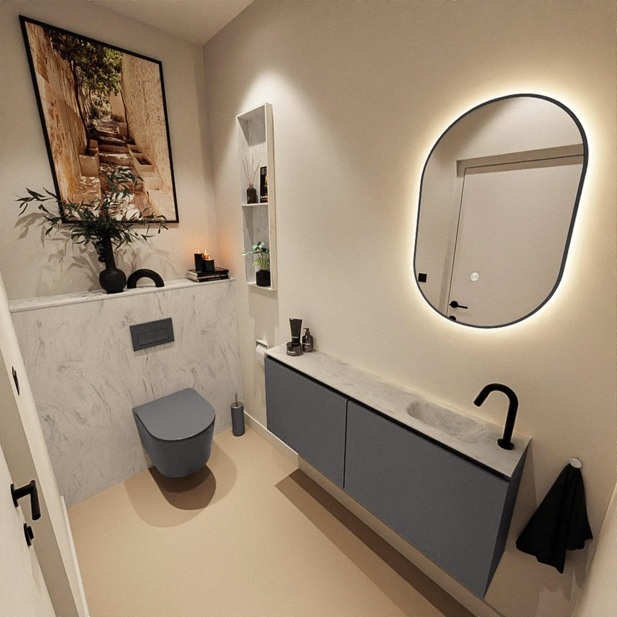 Avec une profondeur de seulement 23 cm, ce meuble est idéal pour les petits WC ou les petites salles de bains où chaque centimètre compte. La longueur de 120 cm permet de bien habiller le mur, sans rétrécir le passage. Comme le lavabo est positionné sur le côté droit, vous conservez davantage d’espace libre de l’autre côté, idéal avec un WC placé perpendiculairement au meuble ou lorsque la porte s’ouvre à proximité. La conception peu profonde offre en outre un aspect élégant et suspendu, ce qui agrandit visuellement l’espace. Vous profitez ainsi d’une véritable solution de lavabo, sans faire de concessions sur l’espace de circulation ou le confort.