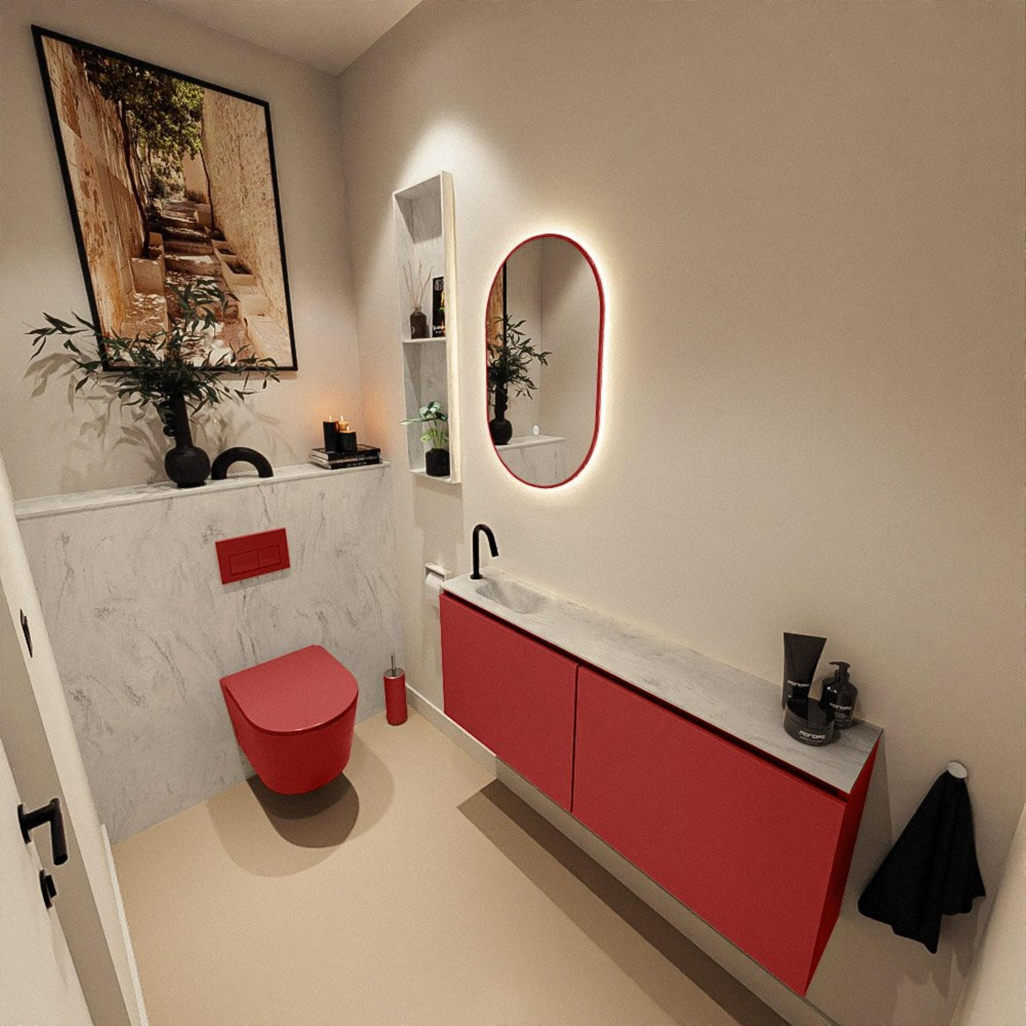Vous cherchez un meuble fin et moderne qui donne une allure luxueuse même dans un petit espace ? Cette combinaison d’un meuble WC peu profond avec lavabo assorti est idéale pour les toilettes d’invités ou une petite salle de bains où vous ne voulez pas faire de compromis sur le style et le confort. Avec une largeur généreuse de 120 cm, vous disposez de suffisamment d’espace de lavage et d’une belle façade continue, tandis que la profondeur de seulement 23 cm laisse le passage libre. La couleur rouge chaude du meuble forme un accent remarquable, tandis que le plan gris aspect pierre et le lavabo intégré créent un look apaisant et haut de gamme. Grâce au trou de robinet à gauche, c’est une solution pratique si votre arrivée d’eau ou l’agencement de la pièce l’exige. Si vous recherchez une solution moderne sans poignées avec un lavabo design qui est à la fois esthétique et pratique au quotidien, c’est un choix judicieux.
