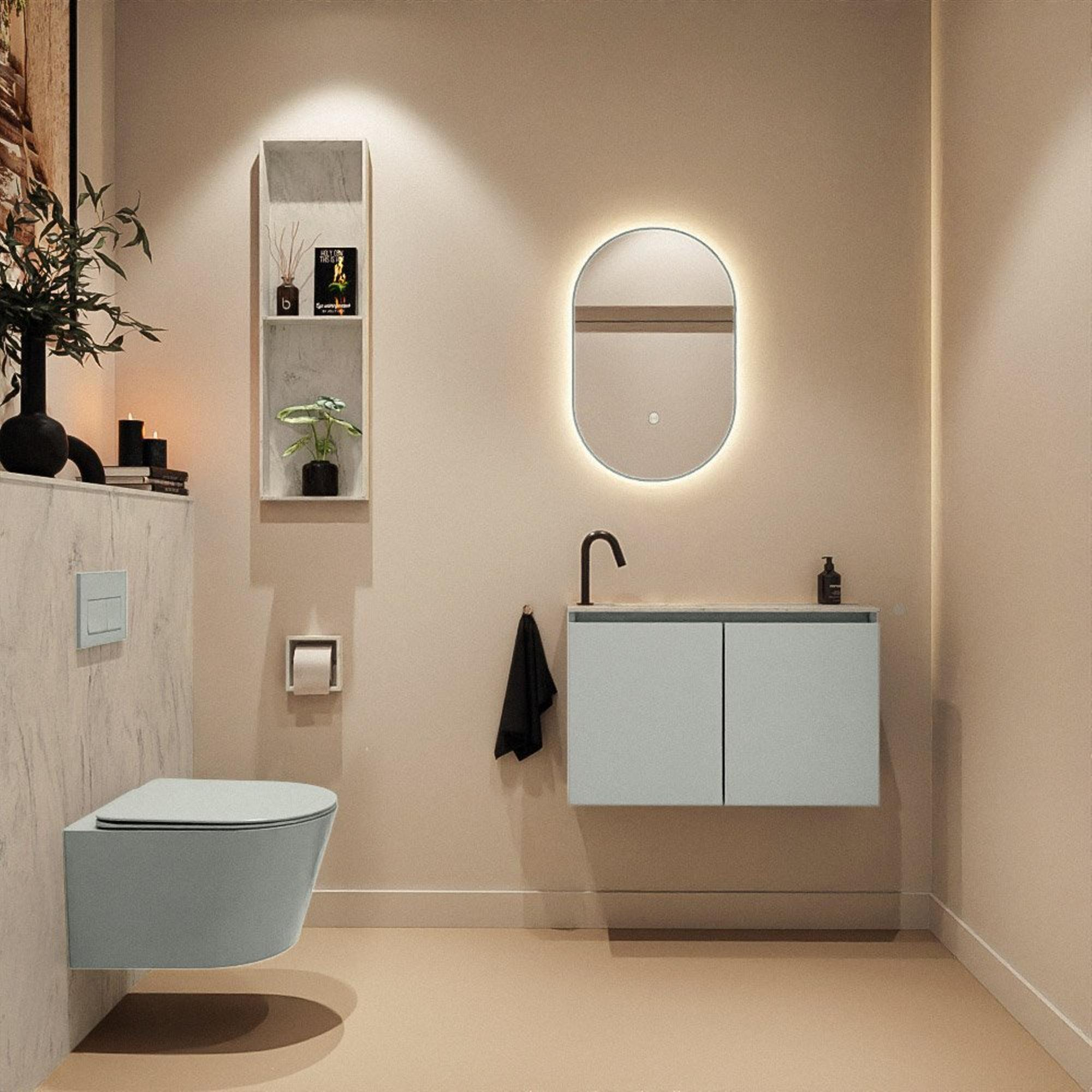 La couleur moderne Greey confère au meuble une apparence contemporaine et discrète qui se marie parfaitement avec des carreaux clairs comme foncés. Le design sans poignées renforce le look épuré et assure un aspect minimaliste et apaisant. Le lavabo Eden assorti dans la teinte Opalo s’y accorde visuellement à merveille : le plan en solid surface a un aspect luxueux, net et haut de gamme. Grâce à l’unique trou de robinet, vous avez largement le choix parmi les petits robinets de lave-mains, ce qui vous permet de prolonger entièrement le style de vos toilettes. L’ensemble forme un set moderne et serein qui donne immédiatement un coup de frais à vos WC.