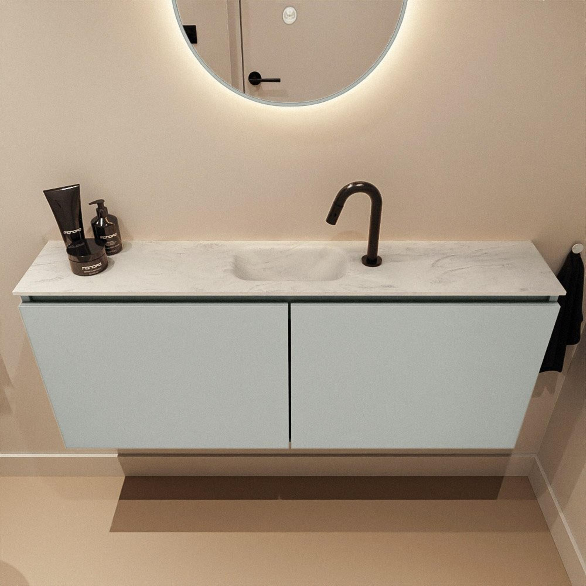 MONDIAZ TURE-DLUX meuble WC 120 cm Greey. Lavabo EDEN Opalo position milieu. Avec 1 trou de robinet.