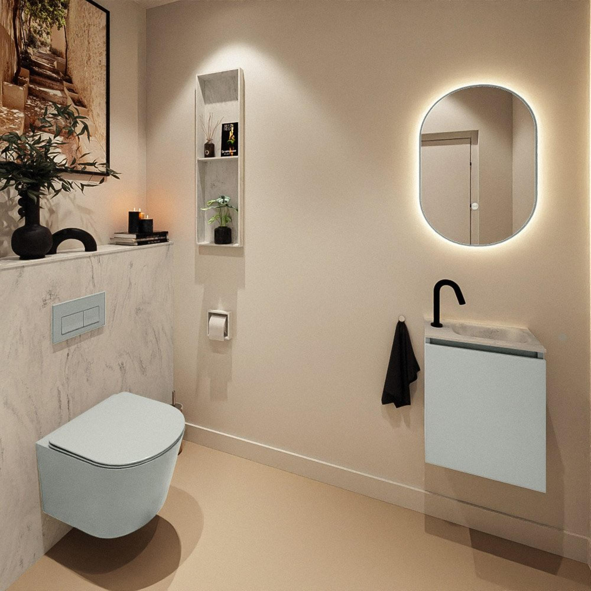 Avec une largeur de 40 cm et une profondeur de seulement 23 cm, ce meuble est particulièrement adapté aux petits WC, aux salles de bains étroites ou à une pièce pour invités où chaque centimètre compte. Sa faible profondeur évite de se cogner au meuble en entrant ou en se levant, tout en offrant suffisamment d’espace pour se laver confortablement les mains. Le lavabo est volontairement positionné à droite, ce qui vous permet de bien planifier la position du meuble par rapport à la porte, aux toilettes ou à un angle. Vous exploitez ainsi l’espace de manière optimale et votre espace WC ne paraît ni encombré ni chargé, mais au contraire calme et aménagé avec réflexion.